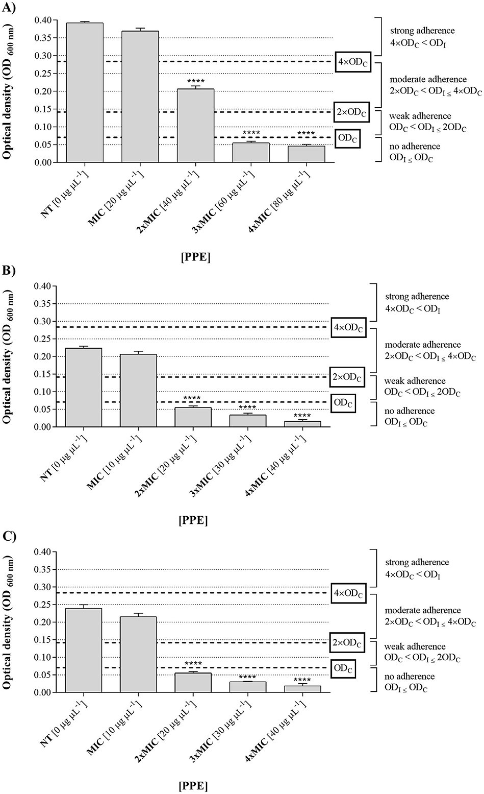 In particular, in the absence of extract (0 μg μL−1) and at a concentration of 20 μg μL−1, the C. albicans isolate was strongly adherent (4 ODnc < ODfc), while increasing concentrations of the tested extract led to a gradual decrease in adherence (Figure 5A). Notably, at a concentration of 40 μg μL−1, the isolate showed moderate adherence (2 ODnc < ODfc ≤ 4 ODnc), whereas at concentrations 3 and 4 times the MIC, i.e., 60 and 80 μg μL−1, the microbial isolate showed no adherence (ODfc ≤ Onc) (Figure 4A). Based on these results, the concentration of 60 μg μL−1 was identified as the MBIC for PPE against the tested C. albicans vaginal isolate (Table 3). Regarding the fungal isolates of C. glabrata and C. parapsilosis, both moderately adherent isolates, they showed a loss of adherence at a lower concentration of PEE, specifically at 20 μg μL−1 (Figures 5B, C), which was identified as the MBIC for both fungal isolates (Table 3).