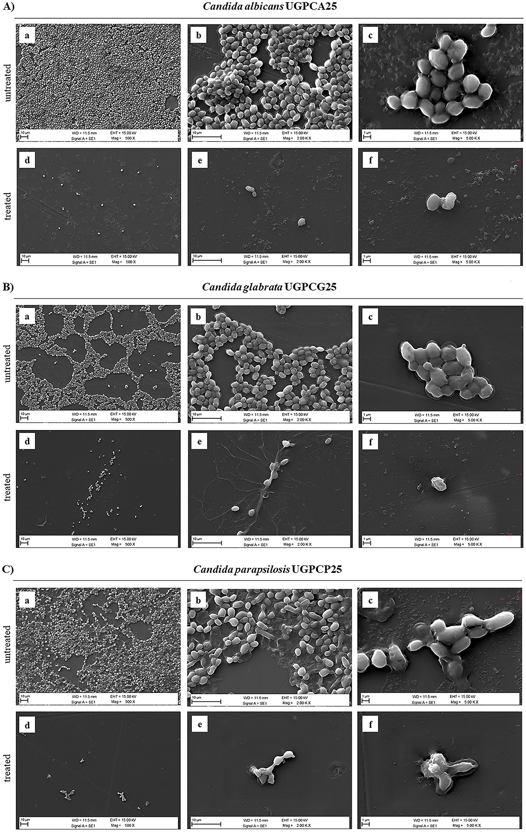 Figure 6. Scanning Electron Microscopy (SEM) images of biofilms formed by Candida isolates, untreated and treated with hydroethanolic pomegranate peel extract (PPE). (A) C. albicans UGPCA25 untreated (a–c) and PPE-treated (d–f); (B) C. glabrata UGPCG25 untreated (a–c) and PPE-treated (d–f); (C) C. parapsilosis UGPCP25 untreated (a–c) and PPE-treated (d–f). Image acquisition via Zeiss EVO 15 HD VPSEM scanning electron microscopy at three magnifications (500×, 2,000×, and 5,000×).