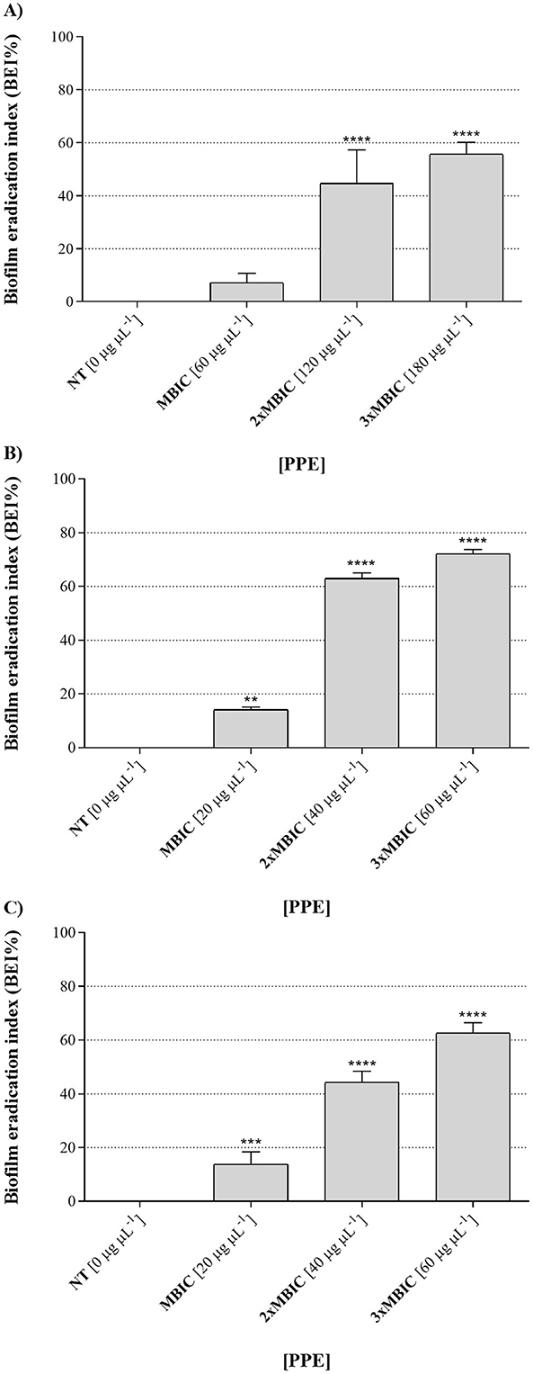 Figure 7. Biofilm eradication activity of hydroethanolic pomegranate peel extract (PPE) against Candida isolates. The figure shows the percentage of biofilm destruction for C. albicans UGPCA25 (A), C. glabrata UGPCG25 (B), and C. parapsilosis UGPCP25 (C) clinical isolates in the presence of MBIC and higher concentrations (2 × MBIC and 3 × MBIC) of PPE. Results are presented as mean ± standard deviation. Asterisks (** p < 0.01; *** p < 0.001; **** p < 0.0001) indicate statistical significance assessed by two-way ANOVA with Dunnett's correction, comparing treated cultures to untreated fungal controls. NT, not treated; MBIC, Minimum biofilm inhibitory concentration.