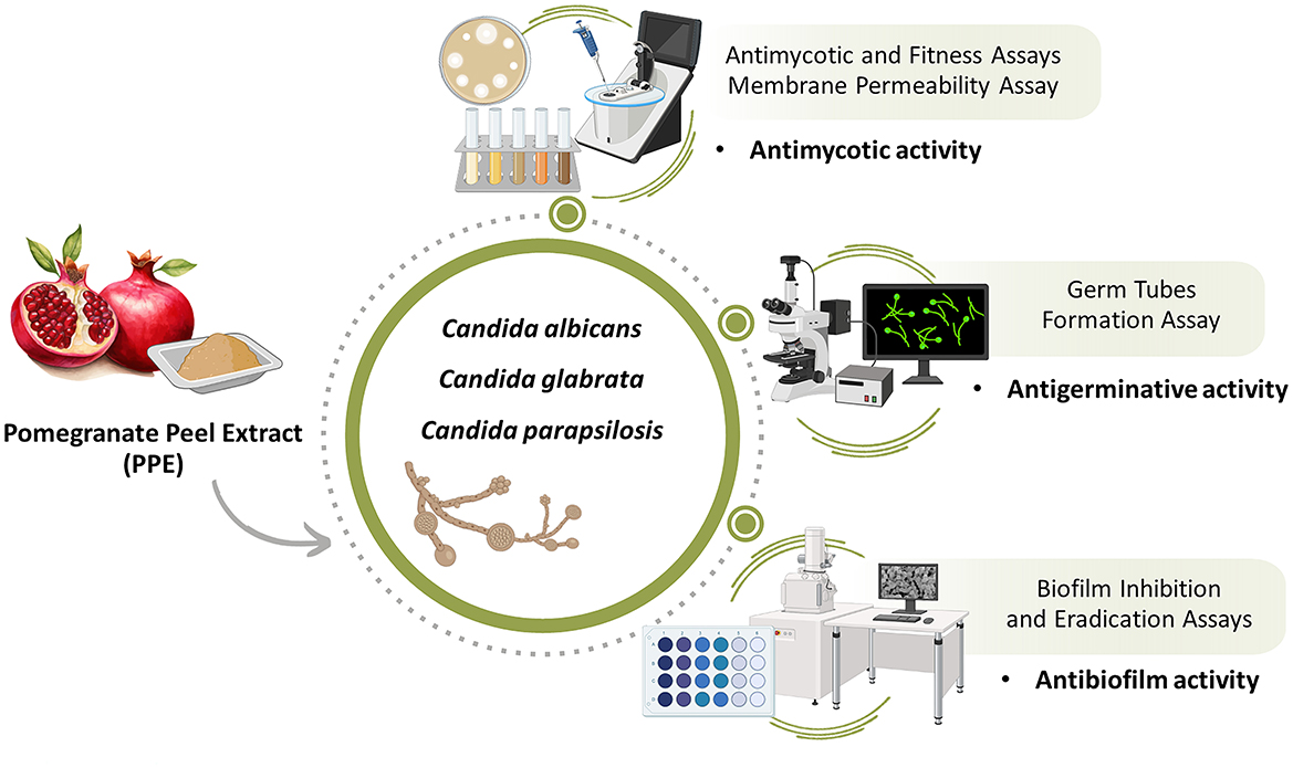 Fungal infections, particularly those caused by resistant Candida species, pose a rising threat to global health, limiting treatment efficacy and escalating morbidity, mortality, and healthcare costs (Arendrup and Patterson, 2017; Mudenda, 2024). This growing challenge underscores the urgent need to develop new antifungal agents, such as those derived from natural sources, which may offer safer, more effective, and sustainable alternatives to current treatments. Among these, pomegranate (Punica granatum L.) has attracted considerable attention for its wide range of pharmacological properties, including antioxidant, anti-inflammatory, anticancer, and antimicrobial effects (Singh et al., 2023). Notably, pomegranate peel is rich in bioactive compounds, including polyphenols and other antioxidants, often present at higher concentrations than in the edible portions of the fruit (Pagliarulo et al., 2016). With the increasing production of pomegranate-based products, this by-product has emerged as an abundant and valuable source for the development of extracts rich in antimicrobial phytochemicals.