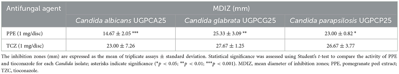 To evaluate the in vitro antimycotic activity of PPE against the tested Candida spp. isolates, an antimicrobial activity test was performed using the agar diffusion method, as described by Bauer et al. (1966), with some modifications, in accordance with the new guidelines from the Clinical and Laboratory Standards Institute (CLSI) [(Clinical and Laboratory Standards Institute (CLSI), 2017)]. Briefly, fungal strains were cultured in PD broth, and 100 μL aliquots of the microbial suspension, with an optical density (OD) of 0.5 at 600 nm, were spread onto PD agar. Subsequently, filter paper discs (6 mm in diameter, Oxoid, S.p.A., Rodano, Milan, Italy), impregnated with the extract (1 mg/disc), were placed onto the solid media. Tioconazole (1 mg/disc) was used as positive control, while the hydroethanolic extraction solution was used as negative control. The plates were incubated under aerobic conditions at 37 ± 2 °C for 24–48 h. After growth, the diameter (measured in mm) of the inhibition zones was determined, and antimycotic activities were expressed as the mean diameter of the inhibition zones (MDIZ) produced by the antifungal agents against the tested yeasts.