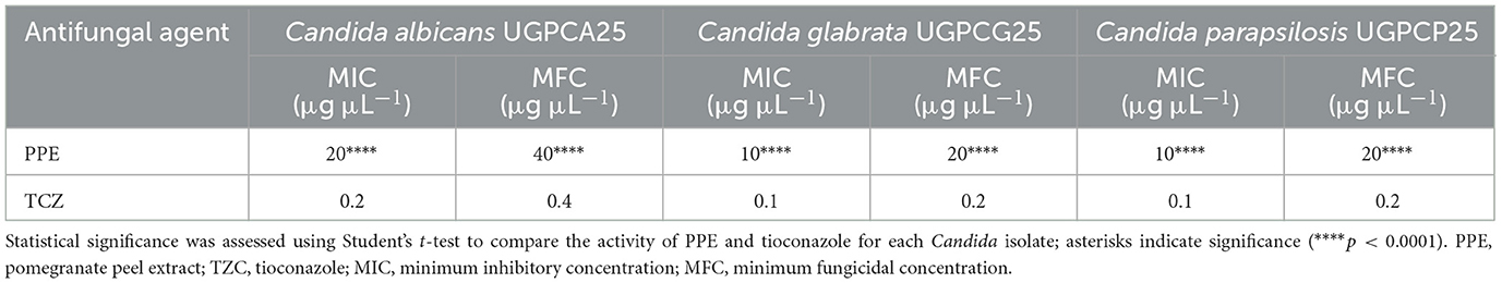 The antimycotic activity of PPE against Candida vaginal isolates was also quantitatively evaluated by the microdilution method, according to the CLSI guidelines (CLSI, 2022). For C. albicans UGPCA25, the MIC value of PPE was 20 μg μL−1, and the MFC value was 40 μg/μL (Table 2). The PPE exhibited a MIC value of 10 μg μL−1 for C. glabrata UGPCG25, while the MBC value was 20 μg μL−1 (Table 2). The PPE exerted a strong fungistatic and fungicidal effect also against C. parapsilosis UGPCP25 with MIC and MFC values of 10 μg μL−1 and 20 μg μL−1, respectively (Table 2). All fungal isolates tested in this study were sensitive to tioconazole tested as a positive control.