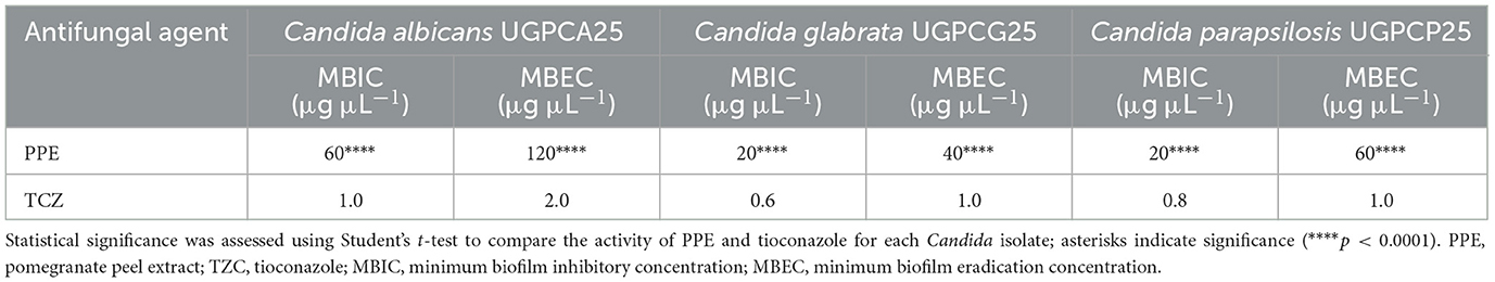 Discussion: These findings highlight the anti-Candida potential of pomegranate peel extract, targeting multiple virulence determinants. The results support the development of alternative therapeutic strategies against emerging biofilm-related fungal infections, leveraging sustainable approaches based on local agri-food byproducts.