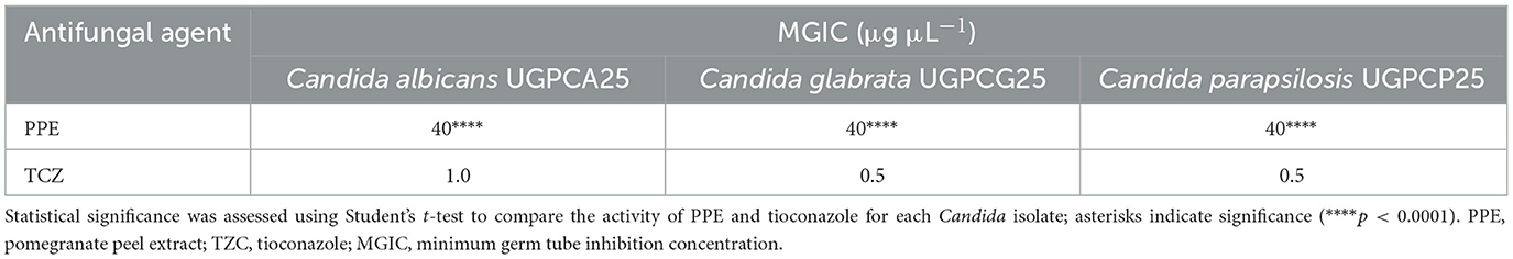 Table 4. Antigerminative activity of hydroethanolic PPE and tioconazole against clinical isolates of Candida spp.