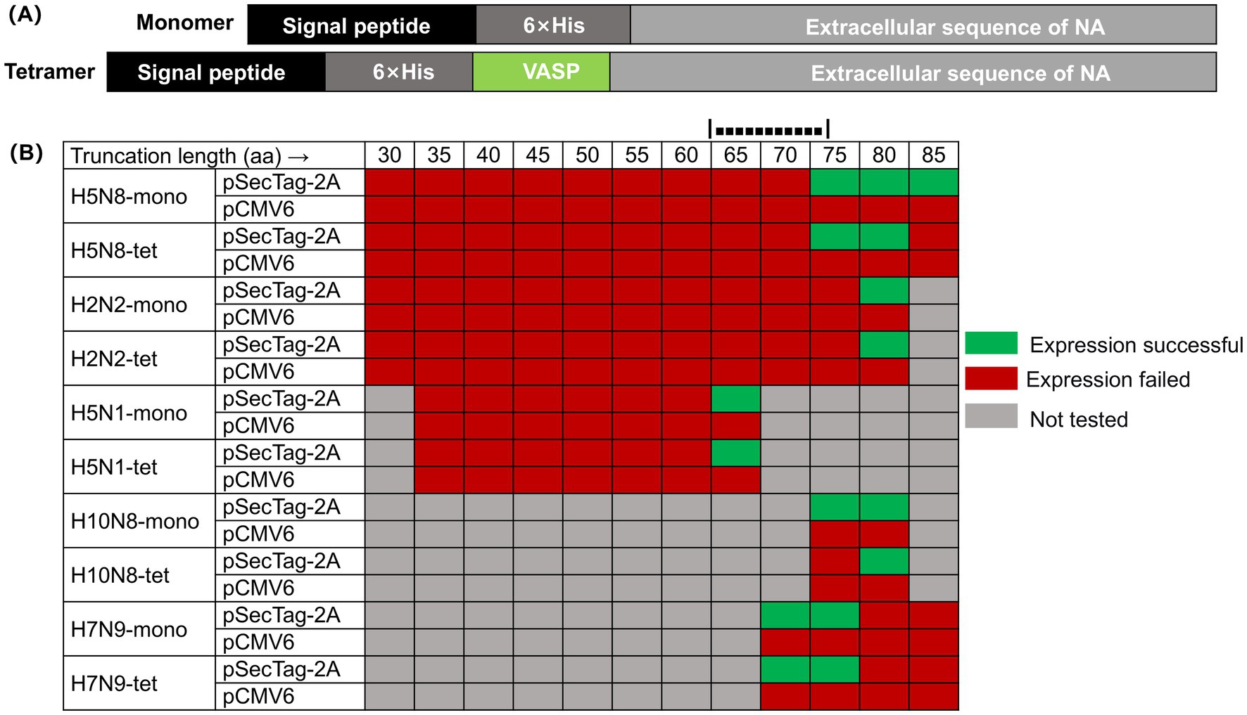 Figure 1. Expression profiles of NA truncation variants in different vectors. (A) Schematic diagram of the construction of the NA recombinant protein expression vector. The monomeric form of the NA recombinant protein is constructed by cloning the sequence encoding the extracellular domain of NA, the 6 × His tag sequence, and the DNA sequence encoding the signal peptide in the same frame; the tetrameric form of the NA recombinant protein introduces the tetrameric domain of human vasodilator-stimulated phosphoprotein (VASP) at the N-terminus. (B) Expression screening of NA N-terminal truncation variants in two mammalian vectors. This figure summarizes the expression results of NA proteins with varying N-terminal truncations (in both monomeric “mono” and forced tetrameric “tet” forms via the VASP domain) in Expi293 cells using either the pSecTag-2A or pCMV6 vector. Green indicates successful soluble expression, red indicates no soluble expression was detected, and gray indicates that the experiment was not performed for that specific combination.