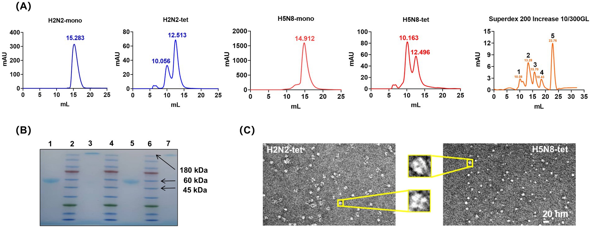 The culture supernatants were collected and subjected to Ni-NTA affinity chromatography followed by size exclusion chromatography (SEC) using a Superdex 200 column. The SEC profiles (Figure 2A) showed that both H2N2-mono and H5N8-mono exhibited high homogeneity, with major elution peaks at around 15 mL, corresponding to a molecular weight of approximately 45 kDa. In contrast, the elution behavior of H2N2-tet and H5N8-tet differed from that of the monomers. The tetrameric proteins tended to aggregate into high-molecular-weight multimers, with major elution peaks observed at around 12 mL, consistent with an apparent molecular weight of approximately 180 kDa.