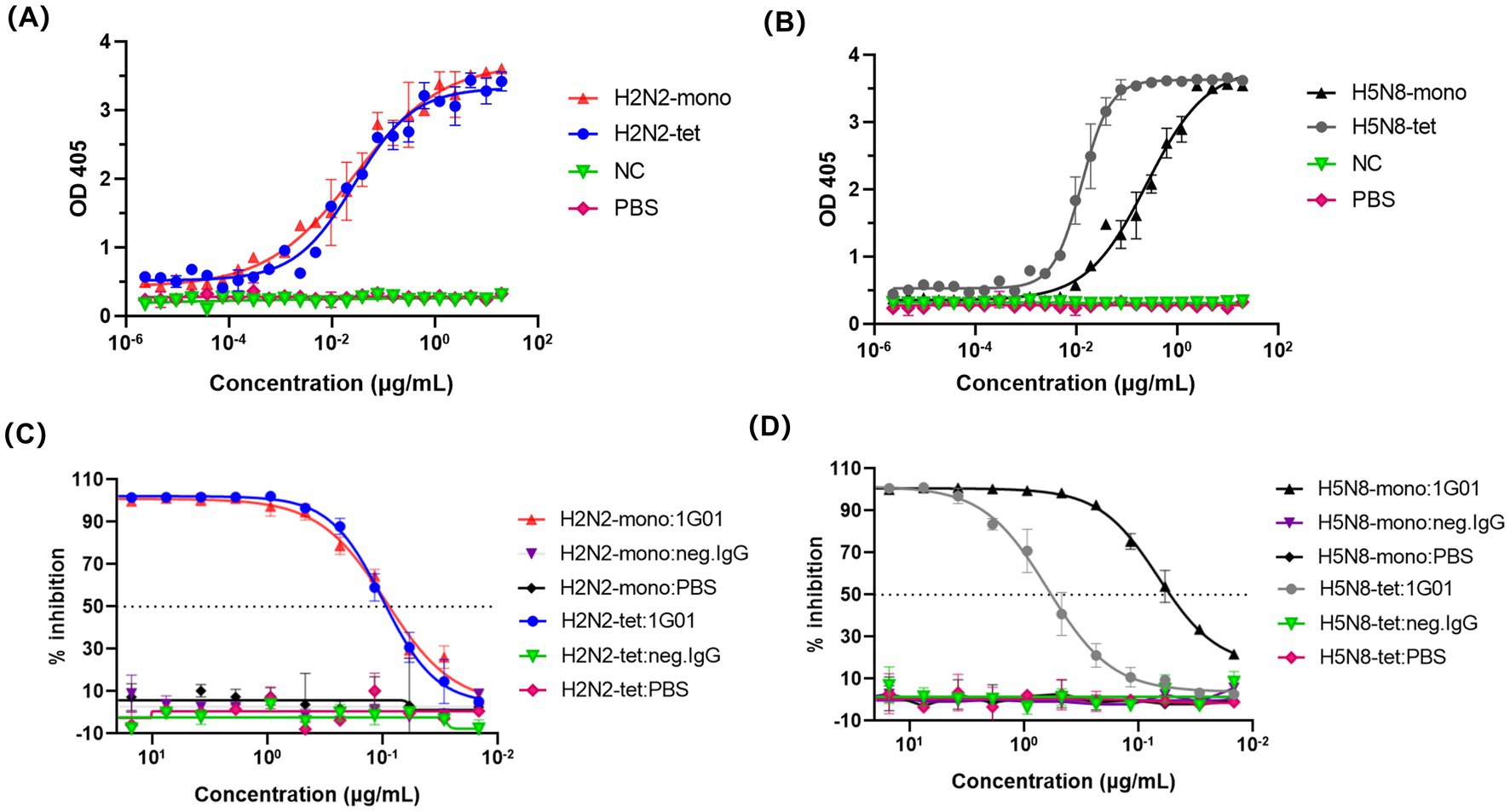 We next evaluated the inhibitory effect of the broadly protective antibody 1G01 (Stadlbauer et al., 2019) on the enzymatic activity of NA. This antibody exerts its protective function by targeting the enzymatic active site of NA, thereby inhibiting the release of viral particles. As shown in Figure 3C, the IC50 values of 1G01 against H2N2-tet and H2N2-mono were 0.099 μg/mL and 0.093 μg/mL, respectively, indicating comparable inhibitory efficacy and further confirming that the monomeric form of this subtype maintains conformational integrity consistent with the tetramer. In contrast, the H5N8 monomer (IC50 = 0.067 μg/mL) was markedly more sensitive to 1G01 than its tetrameric form (IC50 = 0.618 μg/mL), as shown in Figure 3D. This observation aligns with the reduced enzymatic activity of H5N8-mono and suggests increased accessibility of the 1G01 epitope. The absence of inter-subunit contacts in the monomer likely alters its tertiary structure, leading to greater exposure of the active-site region and enhanced antibody-mediated inhibition.