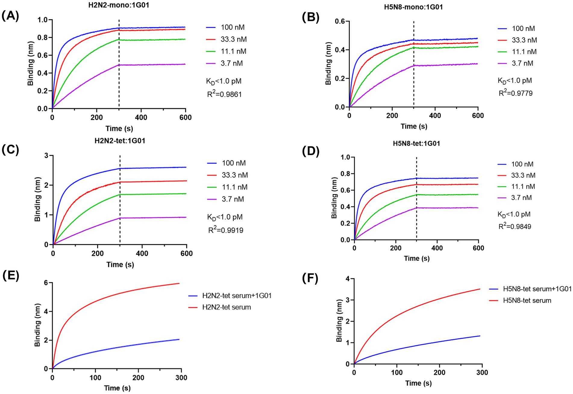 Figure 4. Analysis of the antigenicity and immunogenicity of NA recombinant proteins. (A–D) BLI technology was used to analyze the binding affinity of NA recombinant proteins with the broad-spectrum antibody 1G01. We determined the affinity constant (KD value) between the NA recombinant proteins and 1G01 and calculated the curve fitting parameter R2 to assess the goodness of fit of the data. The calculated KD values for the binding affinity of the four NA recombinant proteins with antibody 1G01 were all below 1 pM. (E,F) BLI technology was used to analyze the proportion of antibodies in the mouse immune serum that have the same binding epitopes as the broad-spectrum protective antibody 1G01. The red curve represents the binding curve of the antigen with antibodies in the serum, and the blue curve represents the binding curve of the antigen with 1G01 until saturation is reached, followed by the binding curve with a mixture of serum and 1G01. The proportion of antibodies in the H2N2-tet immune serum that compete for epitopes with 1G01 was calculated to be 65.91%; the proportion of antibodies in the H5N8-tet immune serum that compete for epitopes with 1G01 was calculated to be 62.74%.