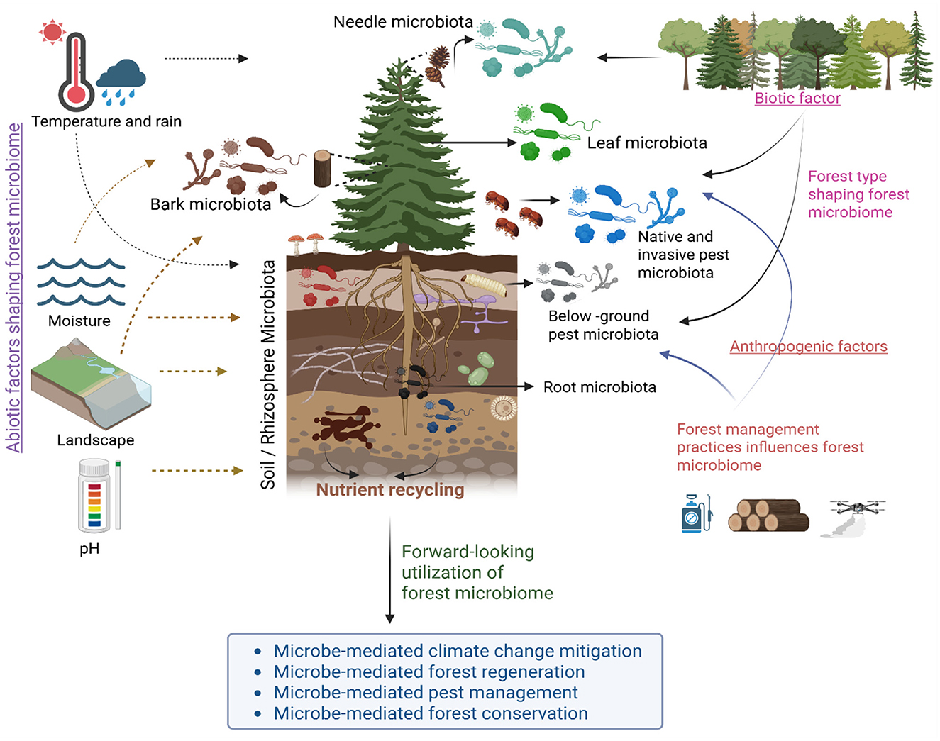 Figure 1. Conceptual framework of factors shaping the forest microbiome and its ecological implications. The forest microbiome is structured by multiple interacting abiotic, biotic, and anthropogenic factors. Abiotic drivers such as temperature, precipitation, moisture, landscape configuration, and soil pH influence the diversity and composition of microbial communities associated with various forest compartments, including the needle, leaf, bark, root, and soil (rhizosphere) microbiota. Biotic factors, including forest type and pest communities (both native and invasive), further shape microbiome structure and function. Anthropogenic factors, notably forest management practices, exert additional influences on microbial assemblages. The forest microbiome contributes to critical ecosystem processes, such as nutrient recycling, and presents forward-looking opportunities for sustainable forestry through microbe-mediated climate change mitigation, forest regeneration, pest management, and forest conservation. Figure created in Biorender.