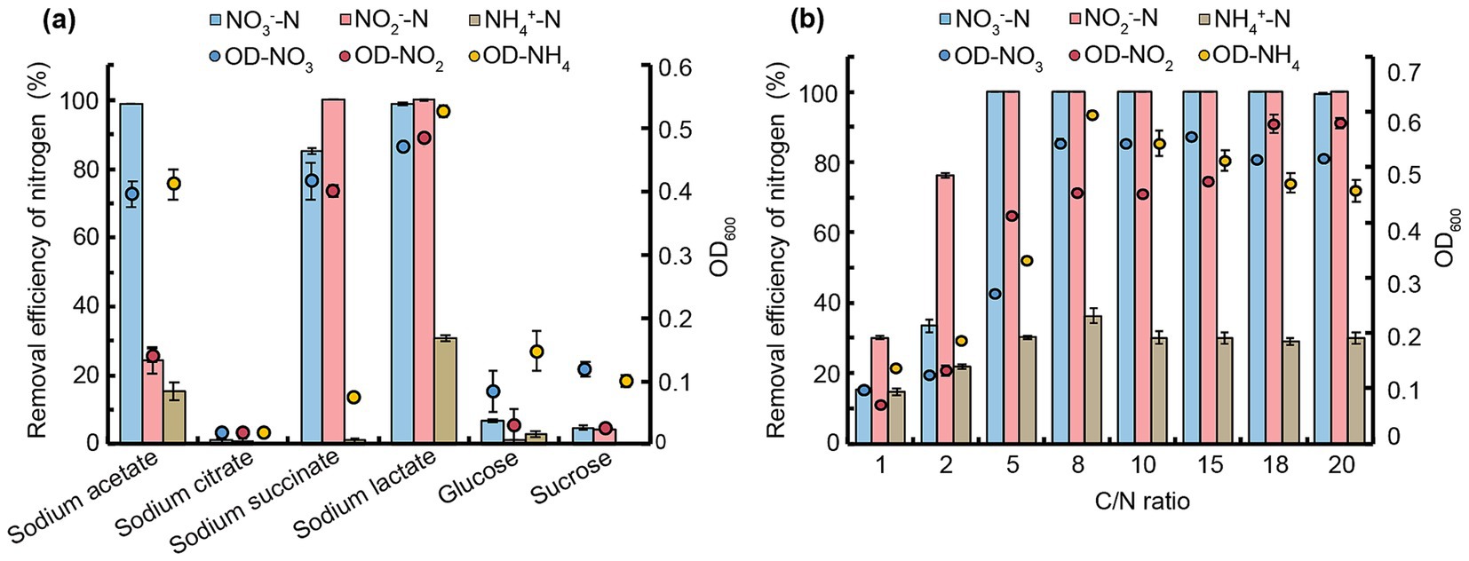 Figure 2. Impact of carbon sources and C/N ratios on NO3−-N, NO2−-N, and NH4+-N removal by strain JM12B12. (a) Carbon sources. (b) C/N ratios. Data shown as mean ± SD (n = 4). OD-NO3, OD-NO2, and OD-NH4 represent OD600 values with NO3−-N, NO2−-N, and NH4+-N as sole nitrogen sources, respectively.