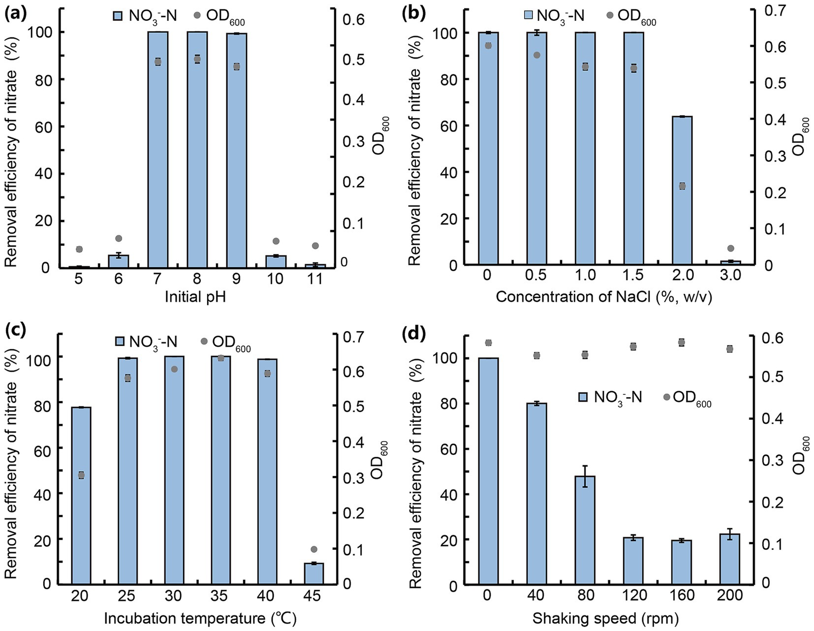 Figure 3. NO3−-N removal by strain JM12B12 in denitrification media across varied conditions. (a) Initial pH. (b) Concentration of NaCl. (c) Incubation temperature. (d) Shaking speed. Data shown as mean ± SD.