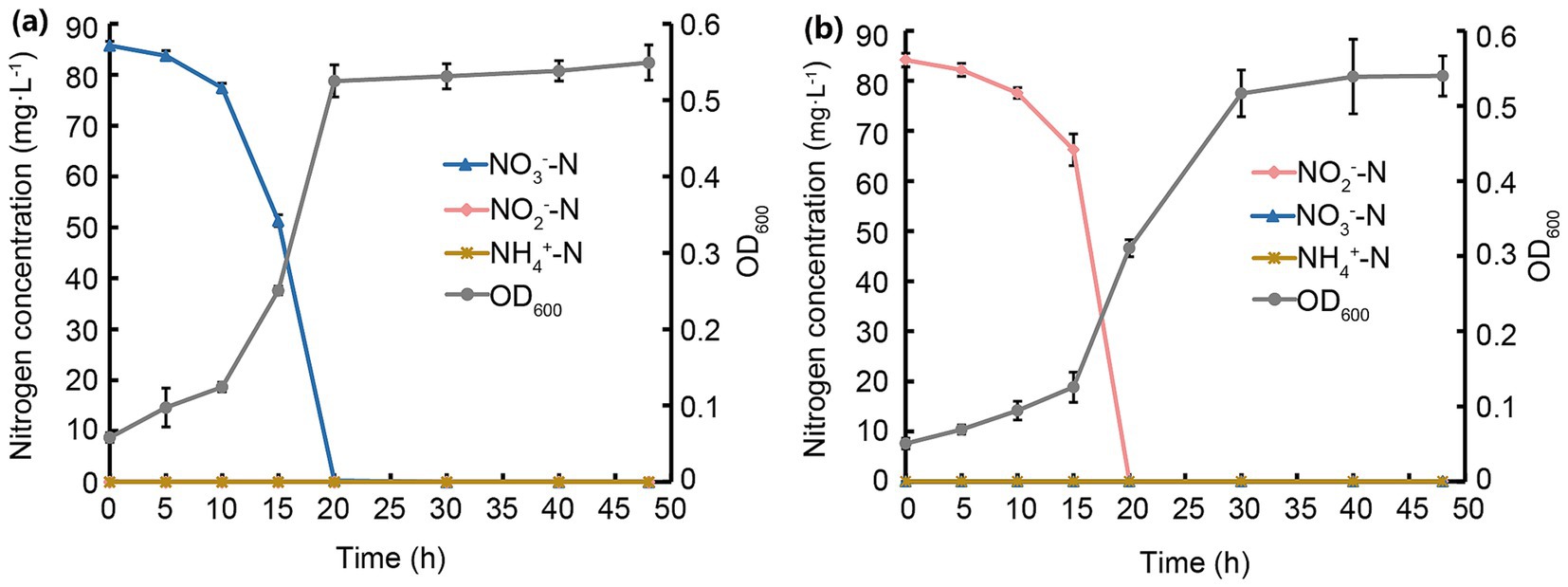Figure 4. Processes of NO3−-N and NO2−-N removal and growth of strain JM12B12. (a) NO3−-N. (b) NO2−-N. Data shown as mean ± SD.