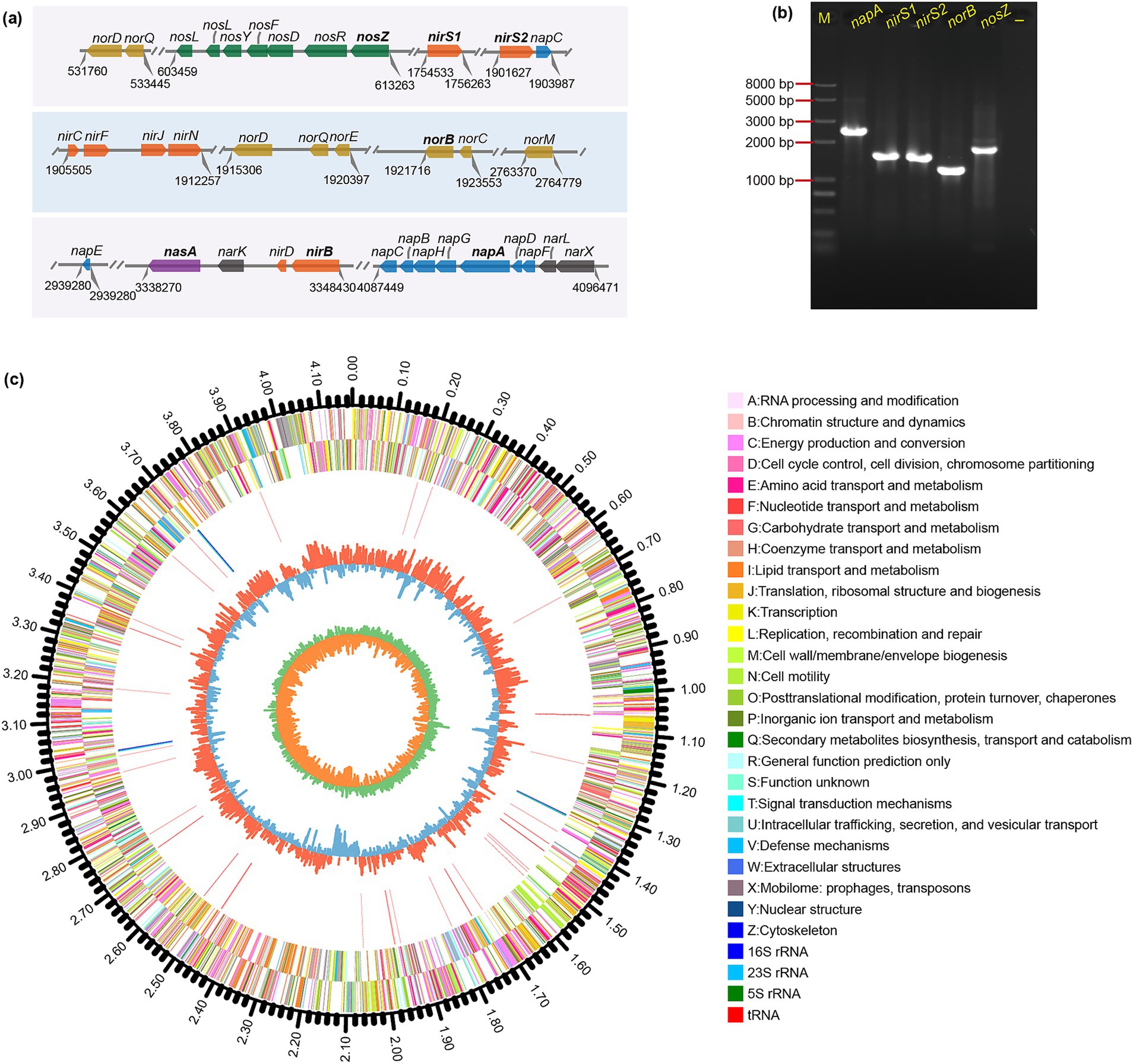 Figure 5. Genomic circular map and functional genes associated with aerobic denitrification in strain JM12B12. (a) Denitrification gene layout, with parallel lines marking sequence breaks and numbers indicating loci. (b) PCR results for aerobic denitrification key genes. -, negative control. (c) Circos plot of the closed circular genome, featuring concentric layers: genome size scale, CDS on both strands (color-coded by COG categories), rRNA/tRNA positions, GC content, and GC skew.