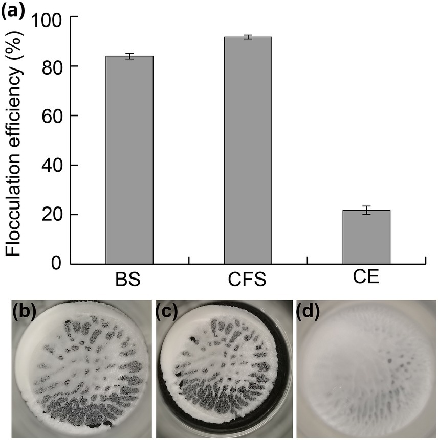 Figure 6. Flocculating activity of bacterial suspension (BS), cell-free supernatant (CFS), and cells (CE) of strain JM12B12. (a) Flocculation efficiencies. (b–d) Images of kaolin flocs with BS, CFS, and CE, respectively. Data shown as mean ± SD.