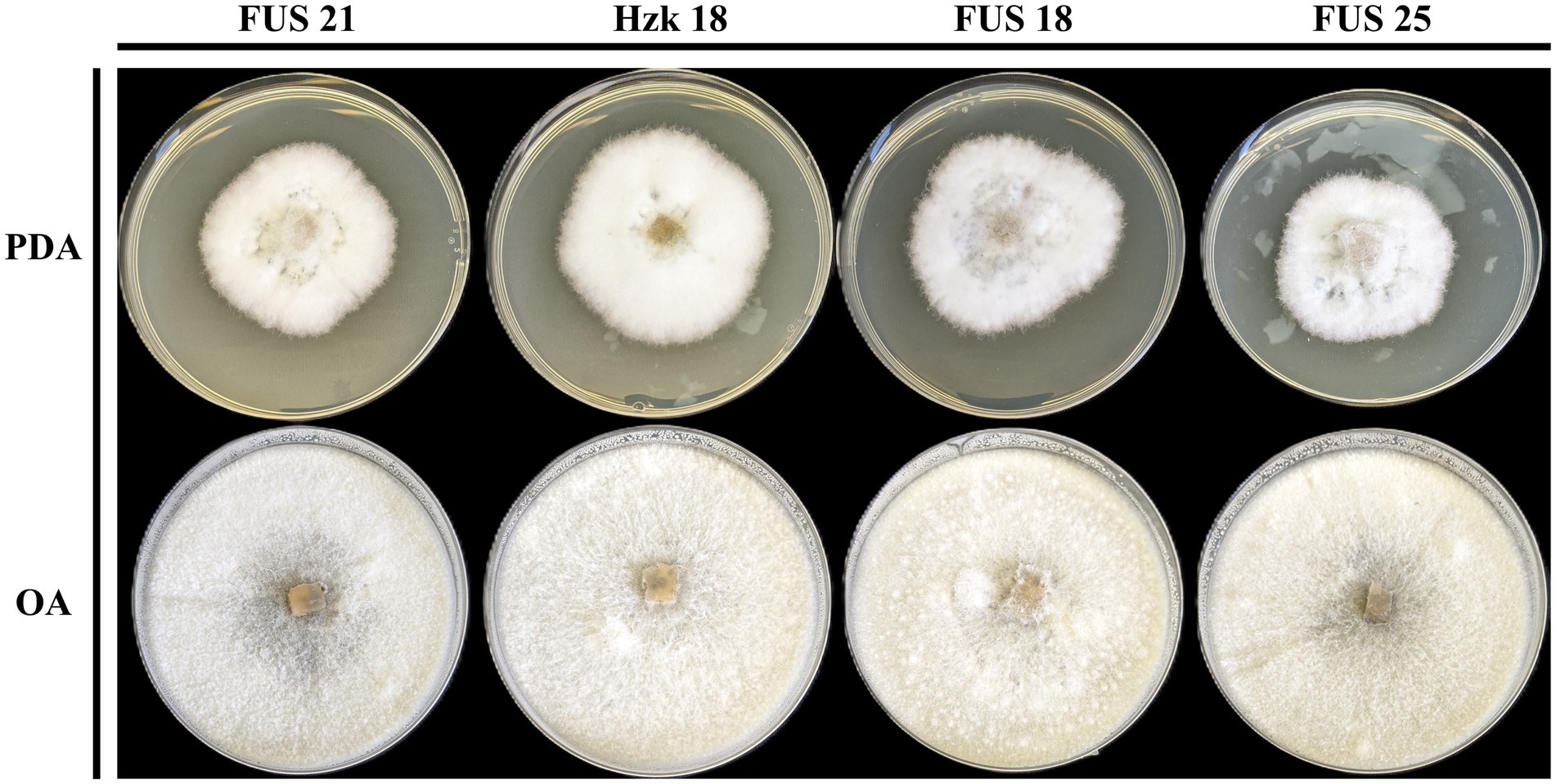 Figure 2. Colony morphology of representative isolates on PDA and OA after 10-day incubation at 25 °C.