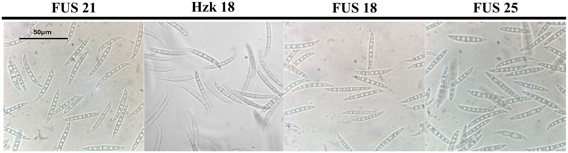 Figure 3. Morphology of macroconidia of isolate FUS 21, Hzk 18, FUS 18, and FUS 25 after 2-week incubation on SNA at 25 °C.