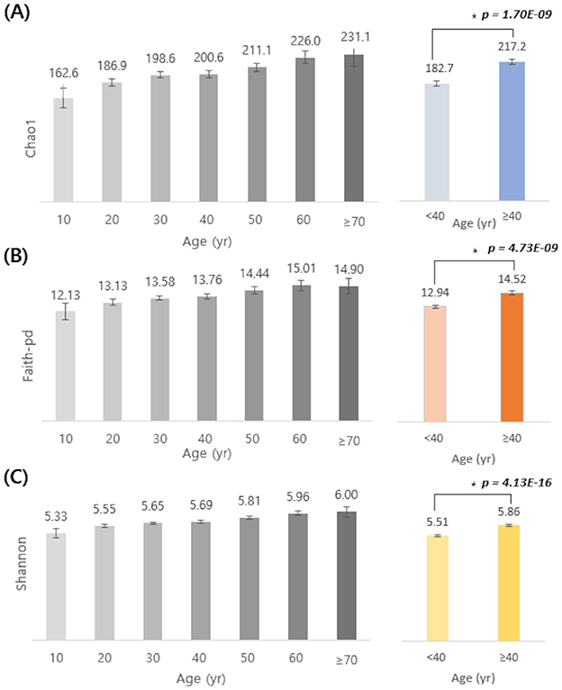 Figure 1. Age-related differences in alpha diversity indices (Chao1, Faith-pd, and Shannon). Alpha diversity indices (A, Chao1; B, Faith-pd; C, Shannon) are shown by age groups (10–70+ years, left) and by two combined groups (<40 yr vs. ≥40 yr, right). Bars indicate mean values and error bars indicate 95% confidence intervals. Statistically significant differences between participants aged <40 and ≥40 years were assessed using a two-sided Student's t-test (*Chao1: p = 1.70 × 10−9; Faith- pd: p = 4.73 × 10−9; Shannon: p = 4.13 × 10−16). Colors denote the two age categories (<40 vs. ≥40).