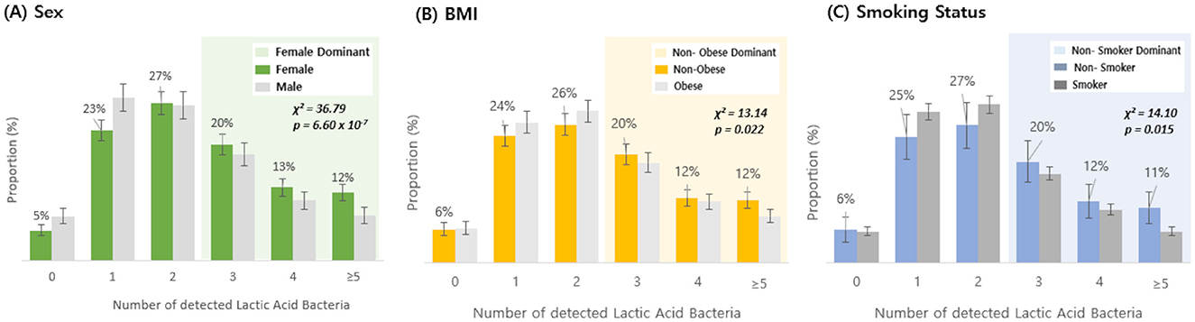 Figure 3. Detection rate of lactic acid bacteria by sex, BMI, and smoking status. The distribution of individuals based on the number of detected lactic acid bacteria (19 species) was compared between groups: (A) female vs. male, (B) non-obese vs. obese, and (C) non-smoker vs. smoker. Shaded areas highlight regions where the dominant group exhibited a higher detection proportion: green shading indicates the range where females had a higher detection proportion than males, yellow shading indicates the range where non-obese individuals had a higher detection proportion than obese individuals, and blue shading indicates the range where non-smokers had a higher detection proportion than smokers. Bars indicate proportions, and error bars represent 95% confidence intervals for the corresponding proportions (normal approximation). Statistical significance was determined by chi-squared test (Sex: χ2 = 36.79, p = 6.60 × 10−7; BMI: χ2 = 13.14, p = 0.022; smoking status: χ2 = 14.10, p = 0.015).