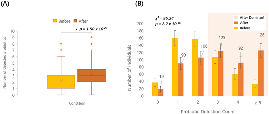 Figure 4. Probiotic detection before and after intake (n = 558). (A) Box-and-whisker plot showing the number of detected probiotic species (out of 19) before and after probiotic intake in the same individuals. Boxes show the interquartile range (IQR) with the median line; whiskers extend to 1.5 × IQR; points represent individual participants, and “ × ” denotes the mean. Pre–post differences were assessed using a paired, two-sided t- test. The mean change (After–Before) was Δmean = 0.95 (95% CI 0.80–1.10) (p = 1.50 × 10−27). (B) Bar plot showing the distribution of individuals by probiotic detection count (0, 1, 2, 3, 4, ≥5) before and after intake. Numbers above bars indicate counts. Error bars represent 95% confidence intervals (N = 558; normal approximation). Distributions were compared using a Pearson χ2 test (χ2 = 96.24, p = 2.2 × 10−16).