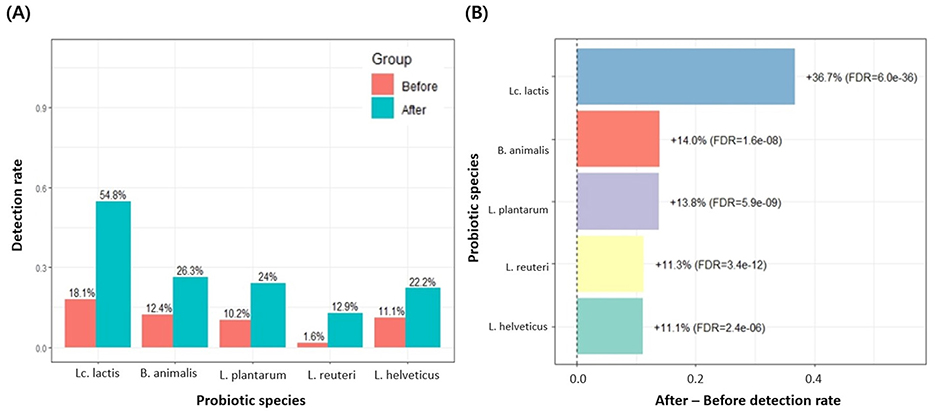 Figure 5. Detection rates of probiotic species with significant changes after intake (FDR < 0.05). (A) Among the 19 MFDS-listed probiotic species, only those showing a significant difference in detection rates between the before and after groups (FDR-adjusted p < 0.05) are presented. Bars indicate the detection rate (proportion of participants in whom each species was detected) in the before and after groups, and numeric labels above the bars represent the corresponding percentages. Lc. lactis, B. animalis, L. plantarum, L. reuteri, and L. helveticus all showed significantly higher detection rates after probiotic intake. (B) Among the 19 probiotic species, only those with a significant difference between the before and after groups (FDR < 0.05 in Supplementary Figure 1) are shown. The x-axis represents the change in detection rate (After–Before), where positive values indicate an increase after intake. Numerical labels next to each bar show the percent increase and the corresponding FDR-adjusted p-value. The vertical dashed line at 0 indicates no change.