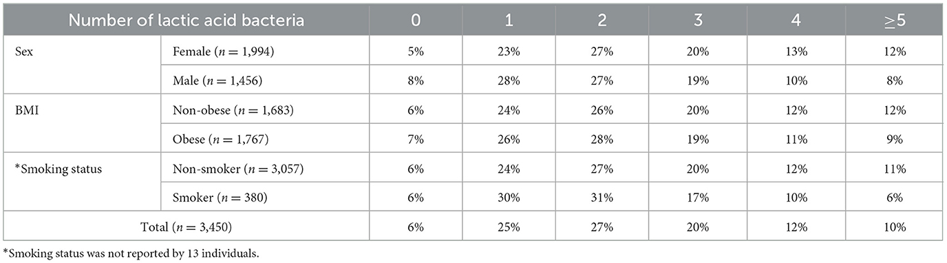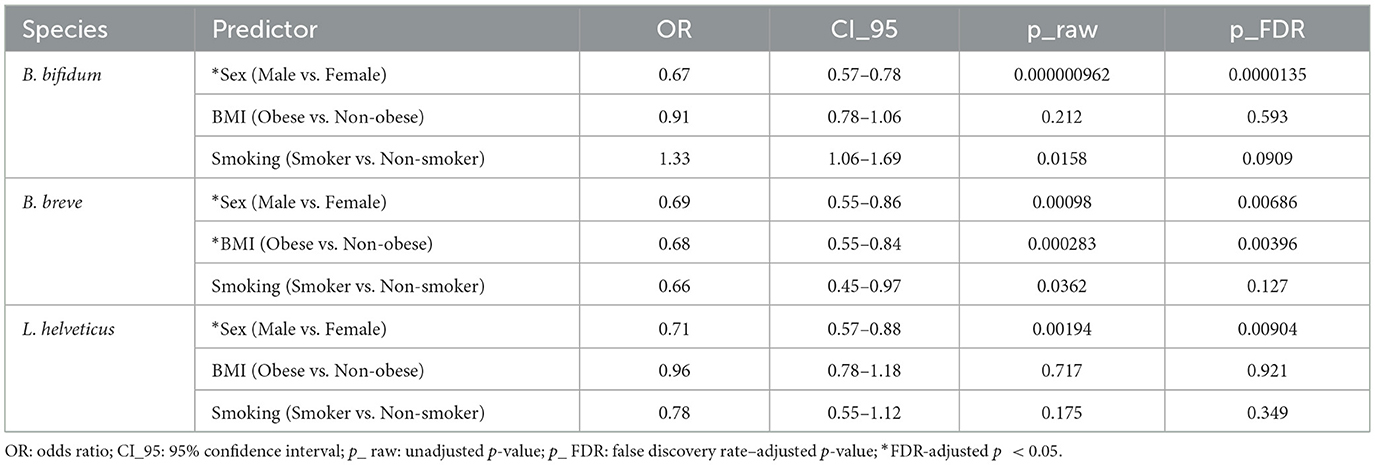 An analysis was conducted on the associations between demographic and lifestyle factors and probiotic detection. Our results showed that women, non-obese individuals, and non-smokers had higher detection rates of three or more probiotic species, suggesting that host demographics and lifestyle characteristics may influence specific aspects of the gut micro biota. To move beyond these univariate comparisons, we additionally fitted multivariable logistic regression models including sex, BMI category, and smoking status. The results indicated that sex and adiposity remained the primary host factors associated with the detection of several species of Bifidobacterium and Lactobacillus whereas smoking-related effects were comparatively modest and did not persist after multiple-testing correction. It is possible that the marked imbalance in sample size between non-smokers and current smokers in this cohort (3,057 vs. 380 individuals) reduced the precision and statistical power to detect more subtle smoking-related associations; therefore, smoking-related findings should be interpreted with appropriate caution. Moreover, because very low-prevalence probiotic species could not be modeled reliably, these multivariable findings are best interpreted as characterizing host–micro biota relationships among taxa that were at least moderately prevalent in this cohort.