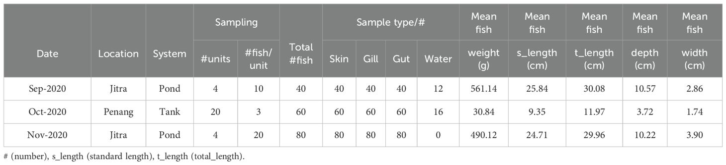 Skin mucus, gills mucus, and gut samples were collected individually from all the tilapia used in this study (Figure 1D). Animals from Jitra were collected from four ponds on two occasions—September and November 2020—to capture potential seasonal variability within the pond environment. In contrast, animals from Penang were collected from 20 tanks once, in October 2020. This was due to logistical and operational constraints, including the requirement that fish be a minimum size for sample collection (Table 1; Supplementary Data Sheet 2). Briefly, for skin samples, two sterile cotton swabs (1 swab/body side) were collected and placed in 1.5 mL screw cap tubes filled with 95% molecular grade ethanol. For the gill samples, we followed a similar procedure in a separate tube, where two sterile cotton swabs were used to collect the mucus from between the gill racks and filaments of at least 3 gill racks per swab for each fish (Figure 1D). For the gut, small pieces of fore-, mid-, and hindgut were dissected out and placed in a separate tube filled with ethanol. Water samples were collected only on two occasions, once at Jitra (September 2020) and once in Penang (October 2020) (Table 1; Supplementary Data Sheet 2). At Jitra, water samples were collected from four ponds at three different depths (surface, 50 cm, and 150 cm) at each pond’s corners. Each sample was collected in 50 mL Falcon tubes (four for each depth), kept on ice, and sent immediately to the lab for processing as described in the Quick Microbiome Sampling Guide (https://hdl.handle.net/20.500.12348/4838).