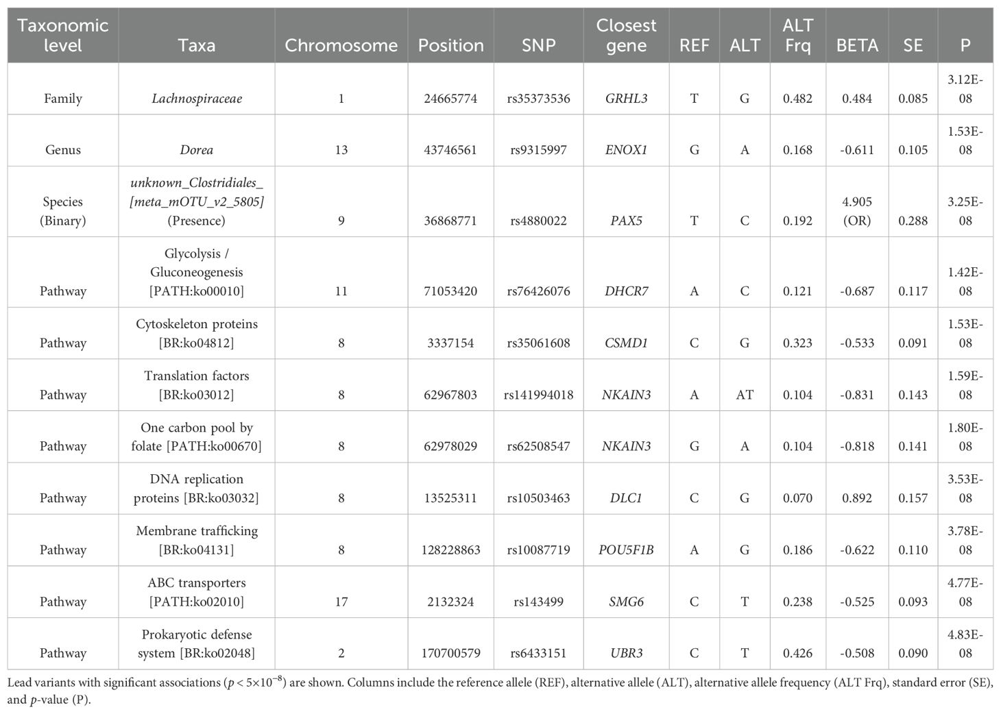 GWAS have successfully identified genetic loci associated with various human traits and diseases (Abdellaoui et al., 2023). Similarly, microbiome GWAS (mGWAS) aims to identify host genetic polymorphisms that interact with the composition and abundance of the gut microbiota. mGWAS have identified significant loci and their connection to bacterial taxa, highlighting the influence of host genetics on microbiome composition in health and disease (Awany et al., 2018).