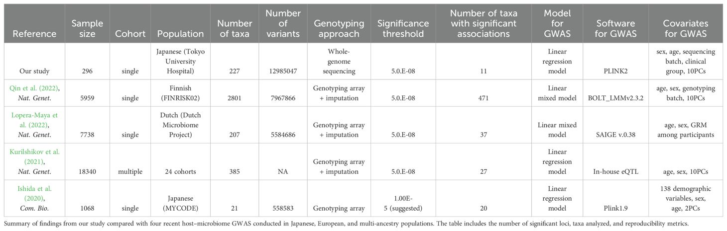 Conclusion: Our findings enhance the understanding of how host genetics shape the gut microbiota in the Japanese population and underscore the importance of methodological standardization in microbiome research. The identified associations between host genetic variants and specific microbial taxa provide insights into the complex interplay between genetics and the gut microbiome. Addressing methodological discrepancies is crucial for improving reproducibility and advancing knowledge of host–microbiome interactions.