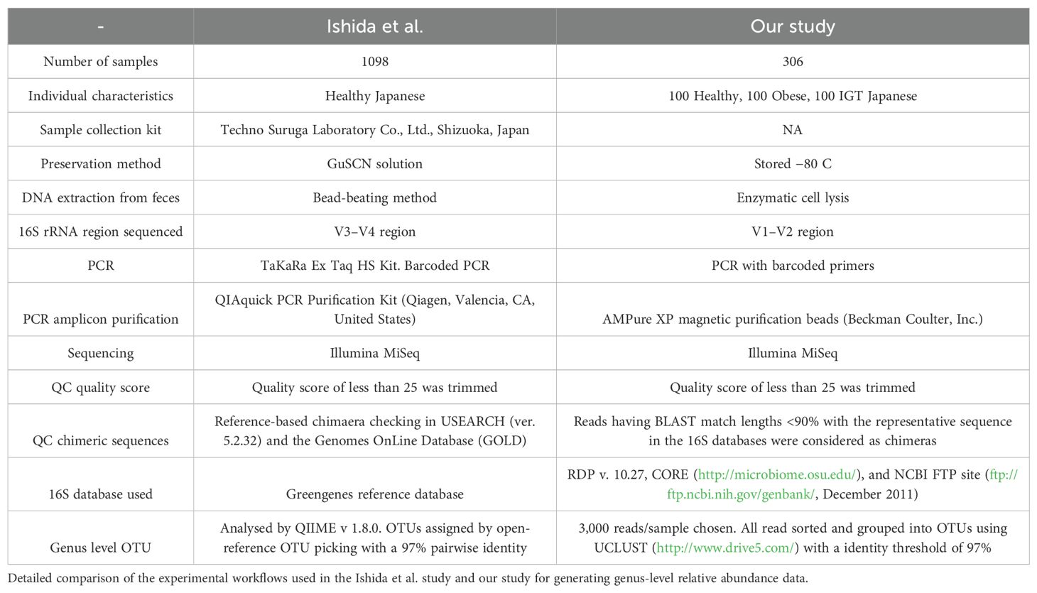 In an attempt to understand the lack of correlation at the genus level between Ishida et al. (2020) study and ours, we utilized two methods to process fecal samples from five healthy subjects, in duplicate, for microbial analysis using 16S rRNA sequencing.
