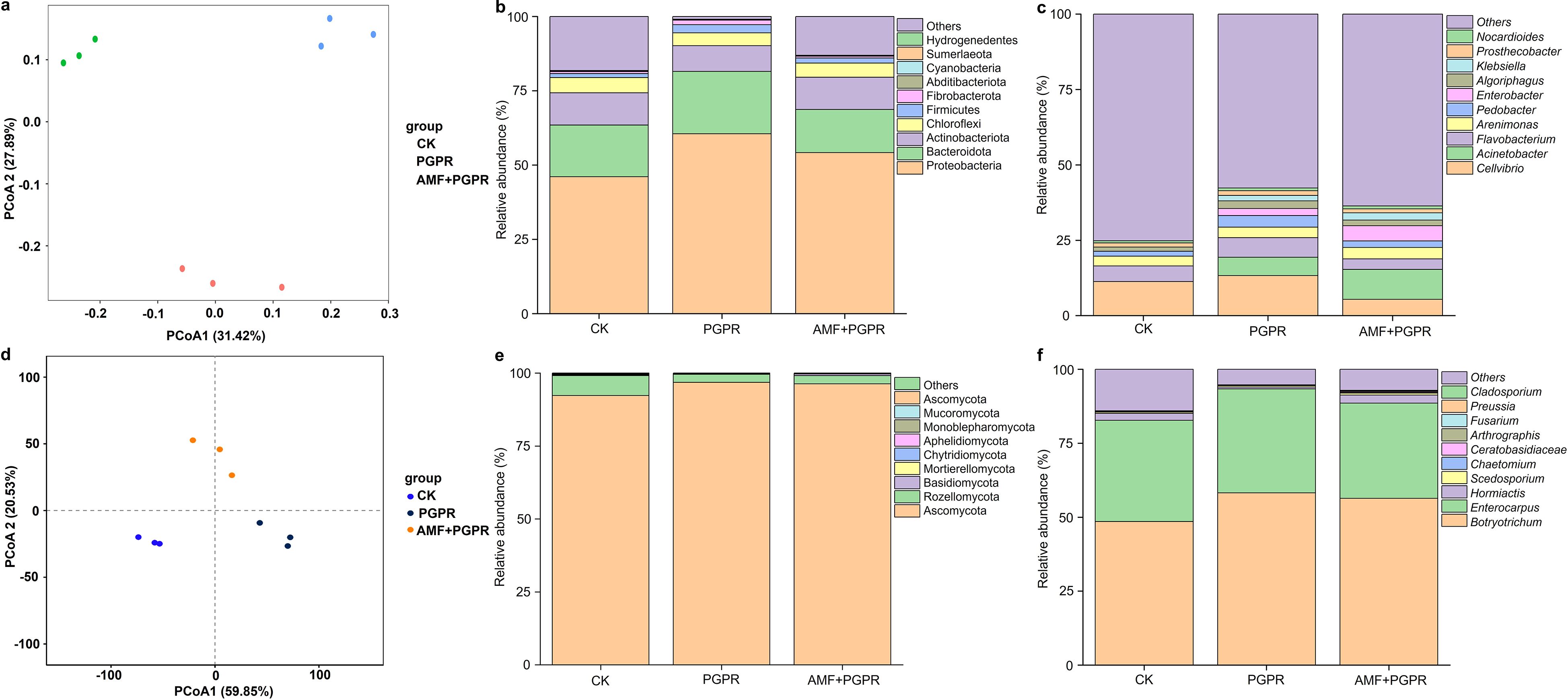 Six-panel figure showing microbial community data. Panel a: PCoA plot with CK, PGPR, and AMF+PGPR groups. Panel b: Stacked bar chart of bacterial phyla abundance in each group. Panel c: Stacked bar chart of bacterial abundance in CK. Panel d: PCoA plot with groups colored CK, PGPR, and AMF+PGPR. Panel e: Stacked bar chart of fungal phyla abundance in each group. Panel f: Stacked bar chart of fungal abundance in CK. Each chart shows different groups and compositions.