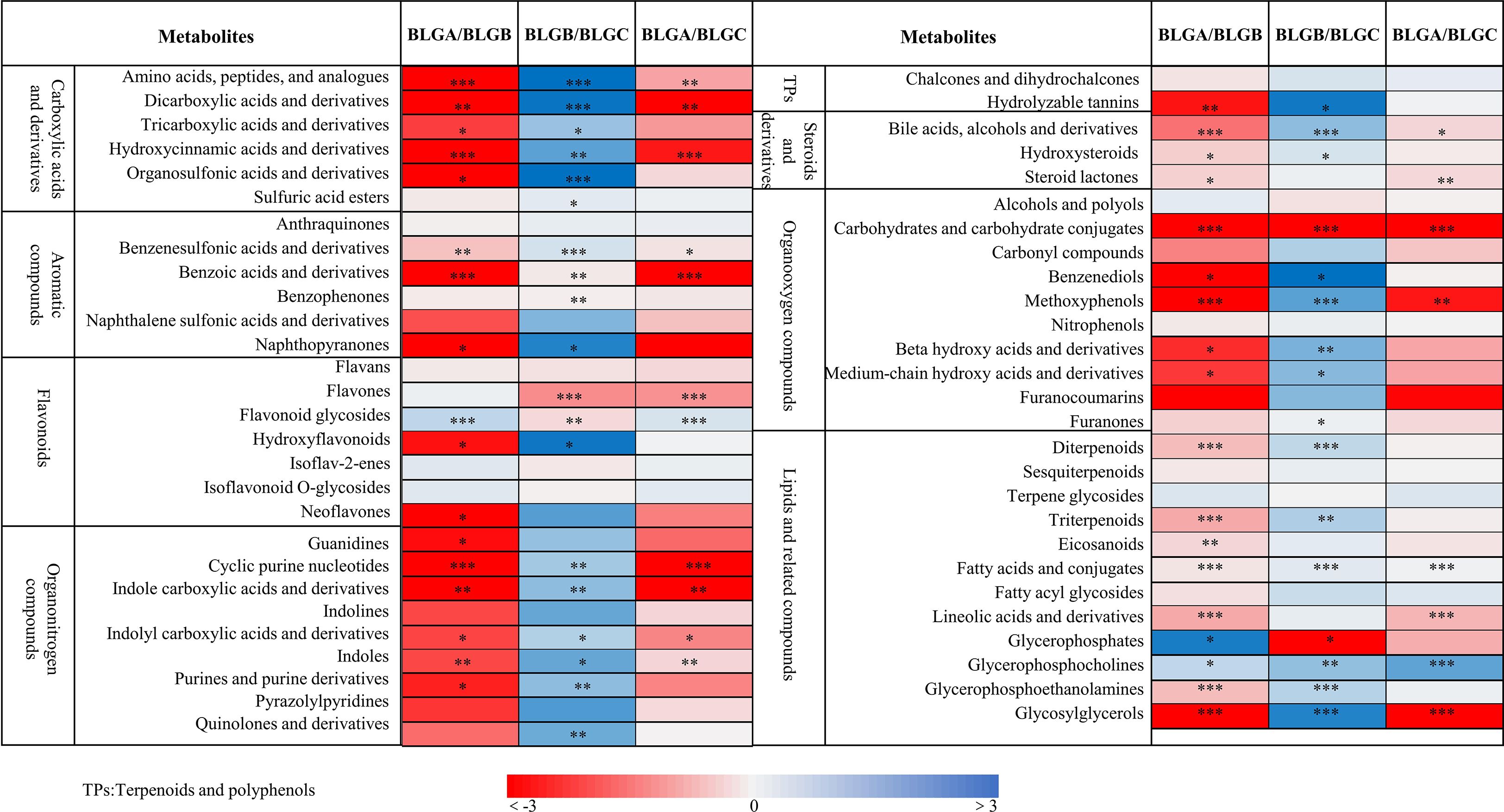 Heatmap comparing various metabolites across three group comparisons: BLGA/BLGB, BLGB/BLGC, and BLGA/BLGC. Metabolites are categorized into groups like carboxylic acids, aromatic compounds, and flavonoids. Color intensity ranges from red (less than -3) to blue (greater than 3), indicating levels of metabolite differences. Some cells are marked with asterisks, possibly indicating statistical significance. A legend at the bottom clarifies color scaling.