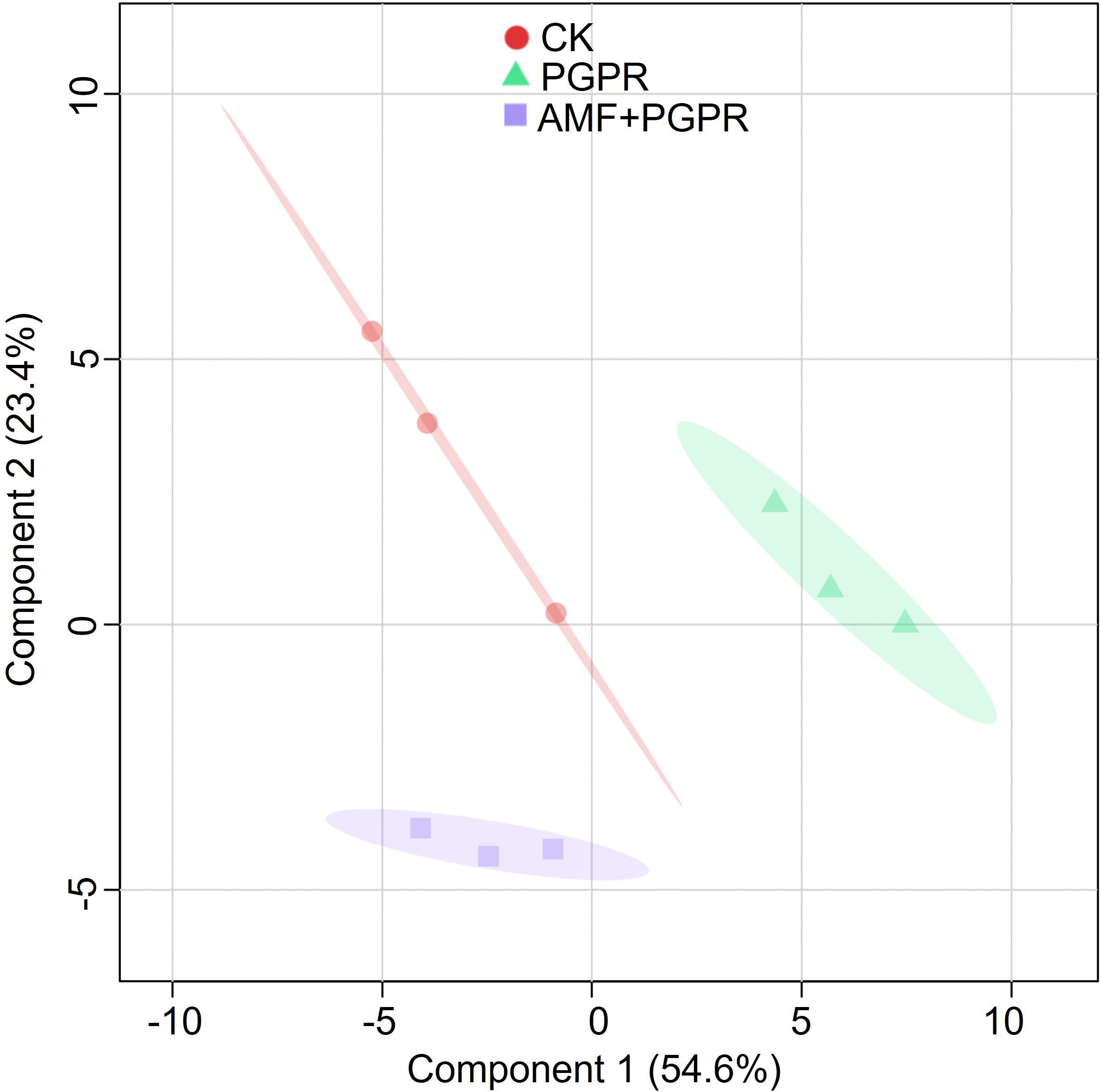 Scatter plot displaying three groups: red circles for CK, green triangles for PGPR, and purple squares for AMF+PGPR. The x-axis is labeled Component 1 (54.6%) and the y-axis Component 2 (23.4%). Each group shows an ellipse indicating distribution.
