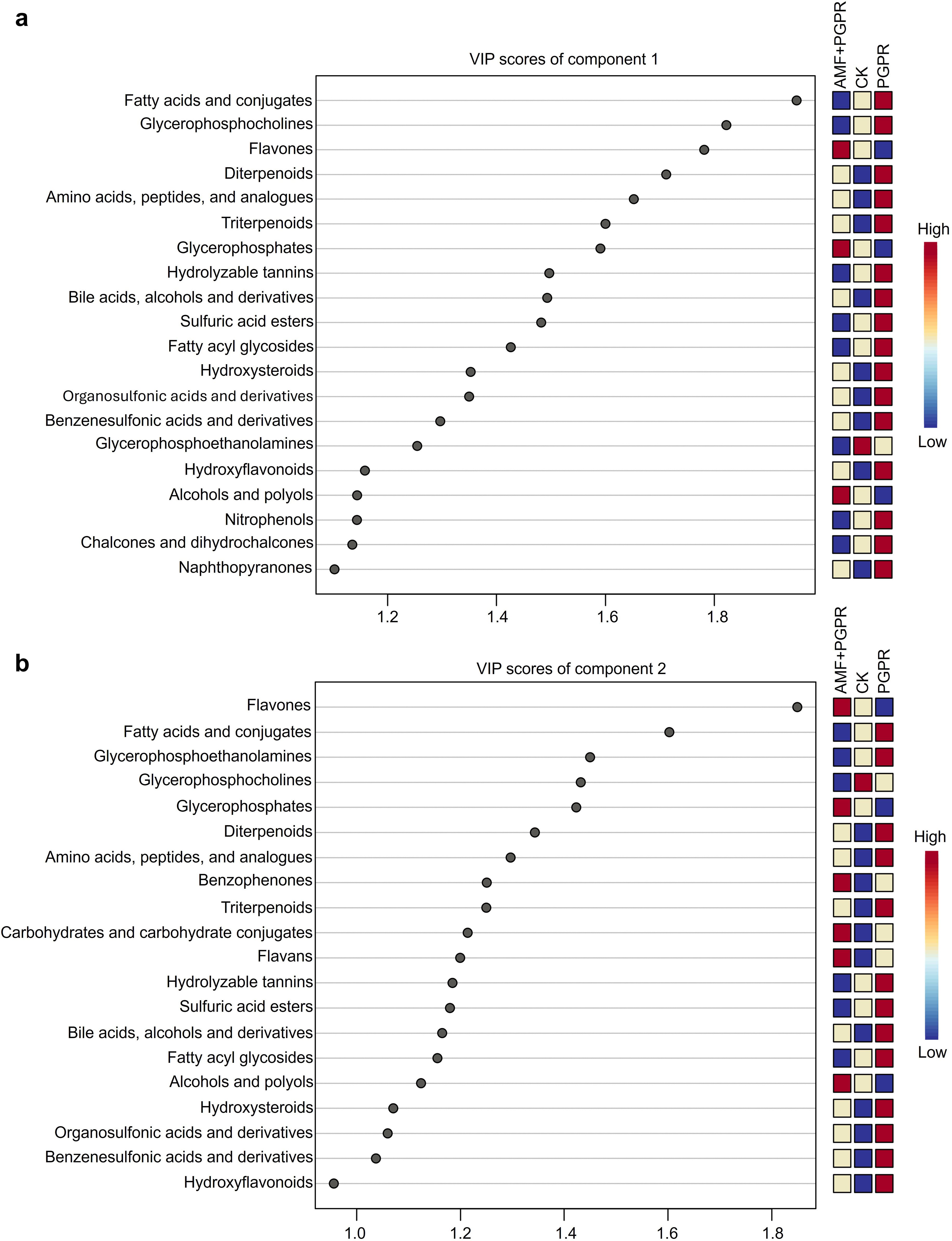 Two dot plots show VIP scores for component 1 and 2. Plot a ranks metabolites like fatty acids and flavones with scores from 1.2 to 1.8. Plot b ranks metabolites like flavones and benzophenones with scores from 1.0 to 1.8. A color scale indicates AMF+PGPR, CM, and PGPR levels from high (red) to low (blue).
