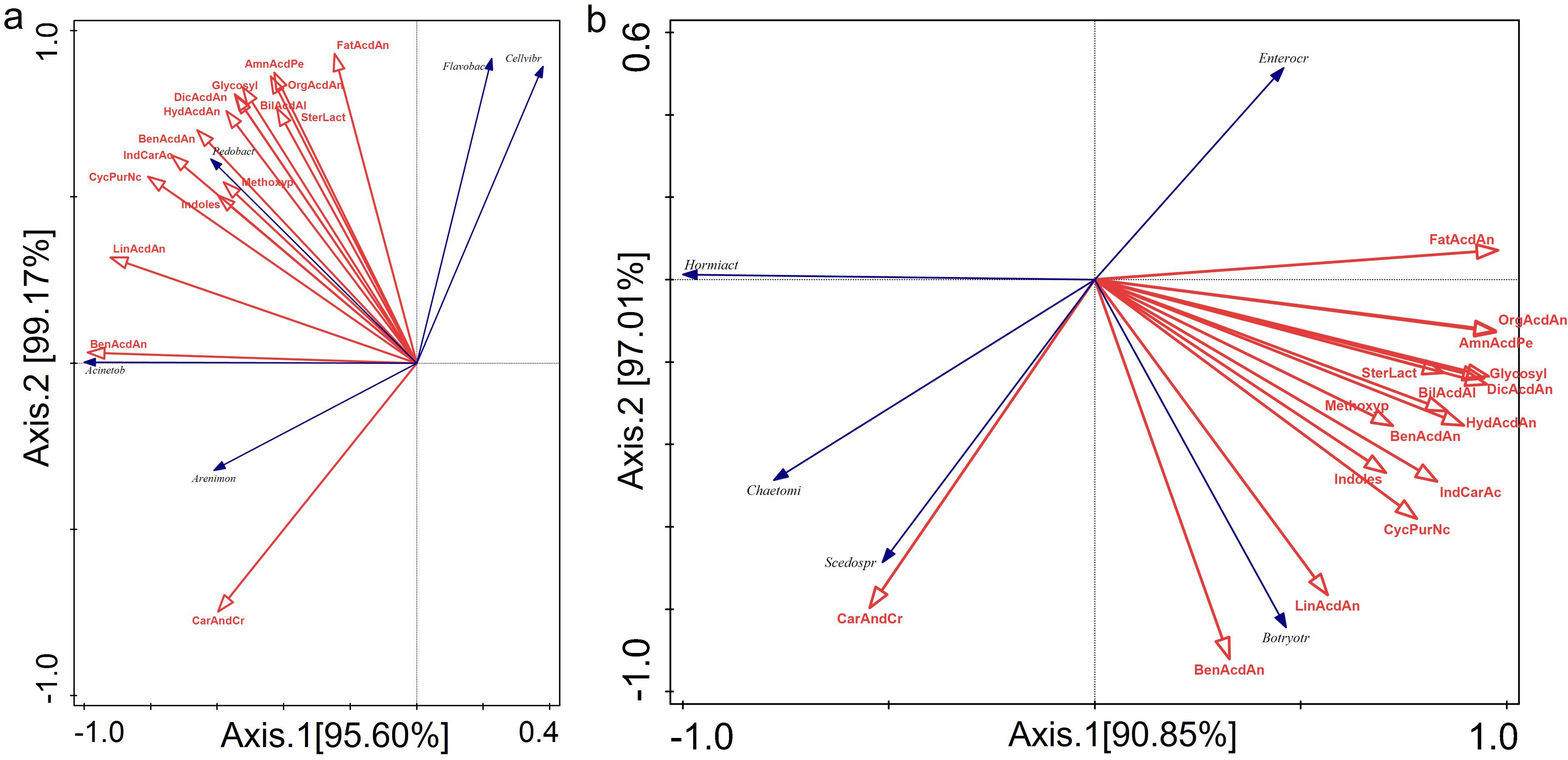 Figure 5. Redundancy analysis (RDA) was performed to investigate the relationship between the dominant bacterial genus (A) and the fungal genus (B), as well as the relationship between the differentially accumulated metabolites. The full names of the bacterial genera abbreviated in figure A are Cellvibrio, Acinetobacter, Flavobacterium, Arenimonas and Pedobacter. The full names of the abbreviated fungal genera in figure B are Botryotrichum, Enterocarpus, Hormiactis, Scedosporium and Chaetomium. The full names of the abbreviated metabolites in the figure are: Amino acids, peptides and analogues; dicarboxylic acids and derivatives; hydroxycinnamic acids and derivatives; organosulfonic acids and derivatives; benzenesulfonic acids and derivatives; benzoic acids and derivatives; cyclic purine nucleotides; indole carboxylic acids and derivatives; indoles; bile acids, alcohols and derivatives; steroid lactones; carbohydrates and carbohydrate conjugates; methoxyphenols; fatty acids and conjugates; linolic acids and derivatives; glycosylglycerols.