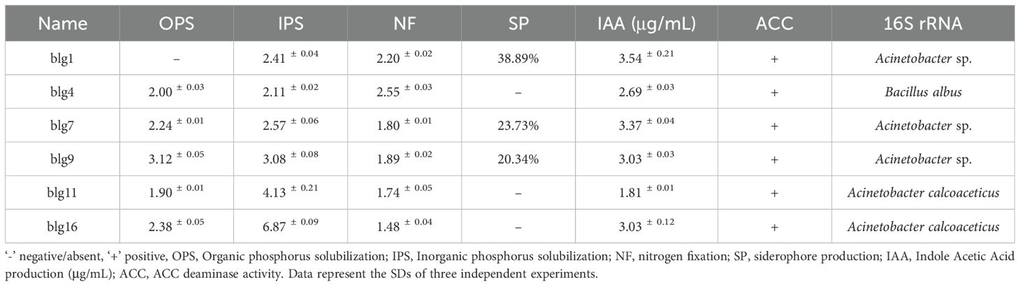 The isolated bacterial strains (blg1, blg4, blg7, blg9, blg11, and blg16) exhibited a variety of plant growth-promoting (PGP) traits, such as phosphate solubilization, nitrogen fixation, indole-3-acetic acid (IAA) production and 1-aminocyclopropane-1-carboxylate (ACC) deaminase activity (Table 1). These traits are essential for enhancing nutrient availability and stress resilience in plants (Trivedi et al., 2020; Sokol et al., 2022). Notably, Acinetobacter sp. (blg1, blg7, blg9, blg11 and blg16) exhibited robust IAA production and phosphate solubilization (Table 1). This aligns with previous reports indicating that Acinetobacter strains promote plant growth by modulating phytohormones and mineralizing nutrients (Rokhbakhsh-Zamin et al., 2011; Josephine and Thomas, 2022). The Acinetobacter calcoaceticus species help to solubilize recalcitrant phosphate in soil, which promotes phosphate availability to plants (Ishaq et al., 2025). The superior nitrogen-fixing ability of Bacillus albus (blg4) (Table 1) further supports its role in improving soil nitrogen content, which is essential for plant biomass accumulation (Bhattacharyya and Jha, 2012; Aasfar et al., 2024). It has been reported that Bacillus albus (DS9) exhibits characteristics of drought stress tolerance and plant growth promotion (Ashry et al., 2022).