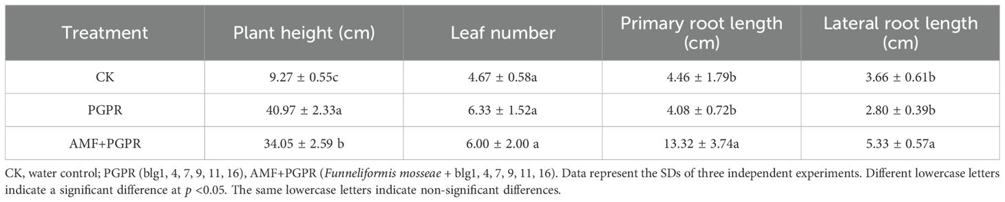 Since the strains were isolated from the rhizosphere soil of Isatis indigotica plants in Guizhou, we first verified their growth-promoting effect. The greatest plant height was achieved with the PGPR treatment alone (p<0.05). By contrast, the PGPR+AMF combination produced the most significant improvement in primary and lateral root length, indicating a specific synergistic effect on root system architecture (p<0.05). However, the number of leaves was not significantly impacted by PGPR and PGPR+AMF treatment (Table 3).