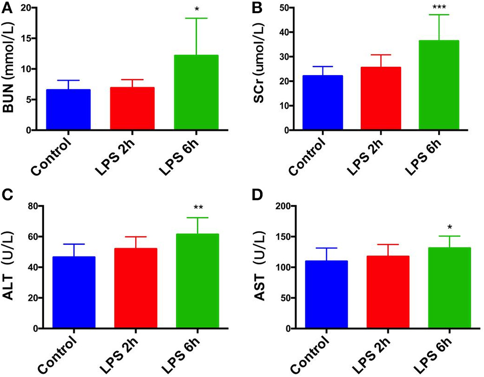 Compared with the control group, the LPS 2 h group showed no significant changes in serum urea nitrogen (Figure 1A), creatinine (Figure 1B), alanine aminotransferase (Figure 1C), and glutamic oxaloacetic aminotransferase (Figure 1D) (p > 0.05). In contrast, the LPS 6 h group showed significant increases in serum urea nitrogen, creatinine, alanine aminotransferase, and glutamic oxaloacetic aminotransferase (p < 0.05, p < 0.001, p < 0.01, p < 0.05, respectively). The result is shown in Figure 1.