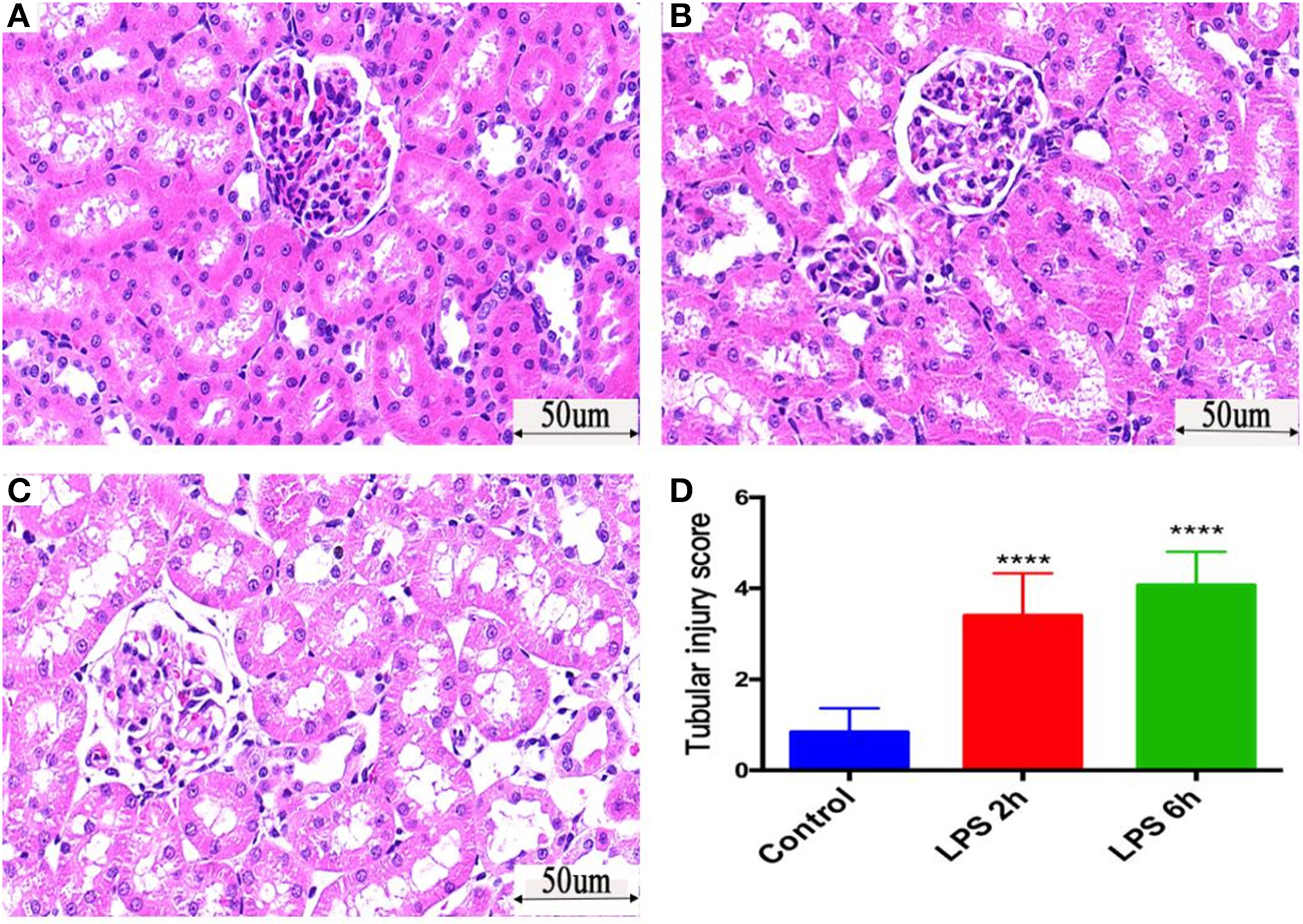 Histological assessment of injury in the kidneys of PBS- or LPS-treated rats by HE-based staining. (A) HE staining of kidney tissue in the control group. (B) HE staining of kidney tissue in the LPS 2 h group. (C) HE staining of kidney tissue in the LPS 6 h group. (D) The renal tubular injury scores in different groups, ****p < 0.0001.