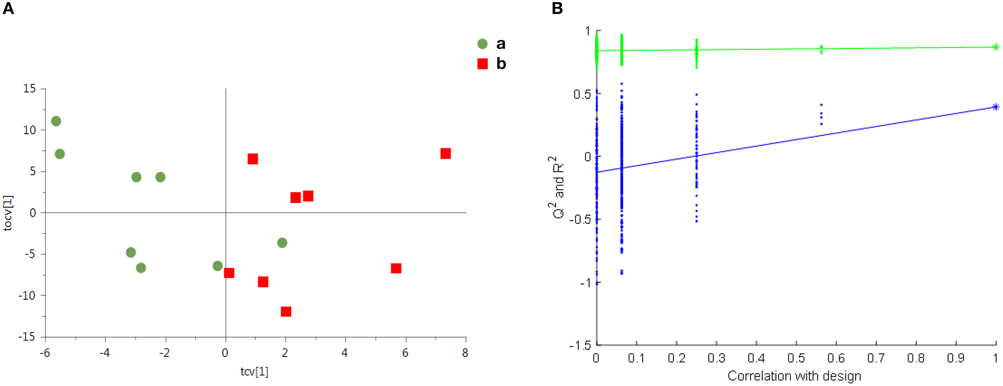 Overall metabolite profile difference between the two groups: (A) the cross validated scores plot of OPLS-DA (Q2Y = 0.49; R2X = 39%; One predictive component and one orthogonal component); (B) 500 permutation times (p = 0.04).