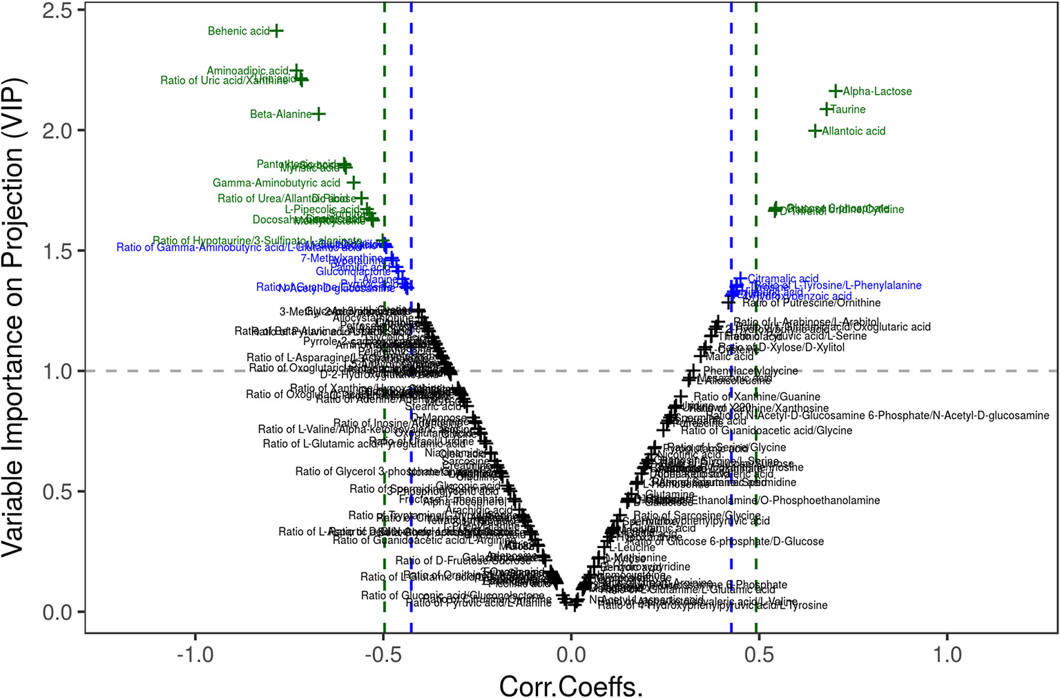 Differential metabolites between the groups using VIP ≥ 1 and Corr. Coeffs. at p < 0.05.