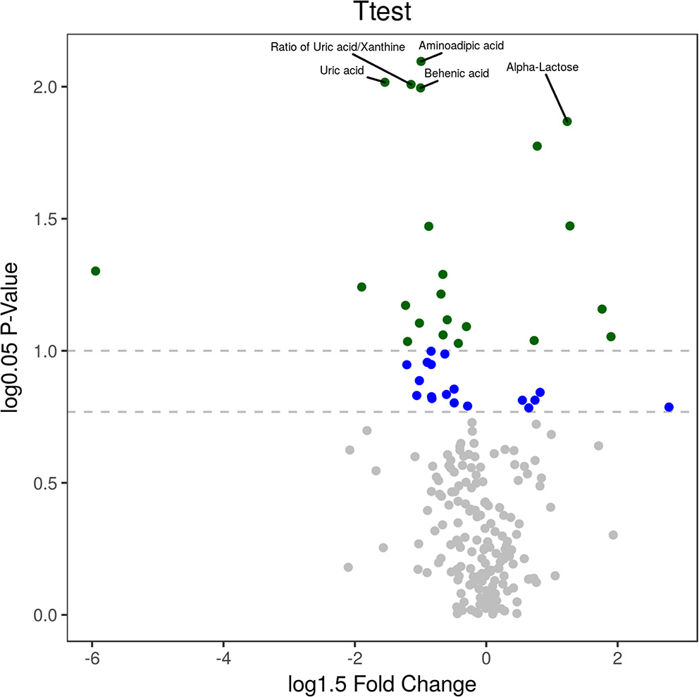 | Ratio of uric acid/xanthine | HMDB00289/HMDB00292 | C00366/C00385 | 2.2 | −0.72 | 1.8e-03 | |