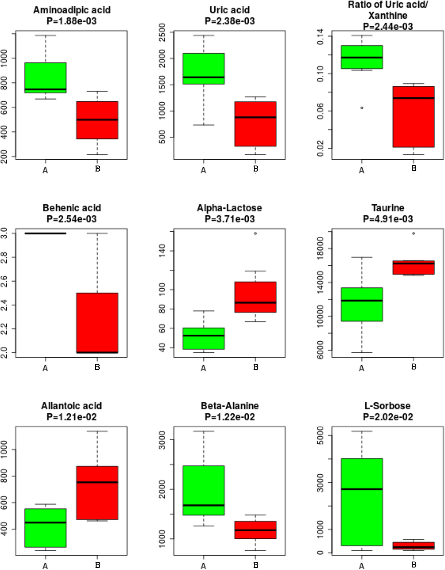 | Amino Acid | Allantoic acid | HMDB01209 | C00499 | 2.0 | 0.65 | 6.5e-03 |
