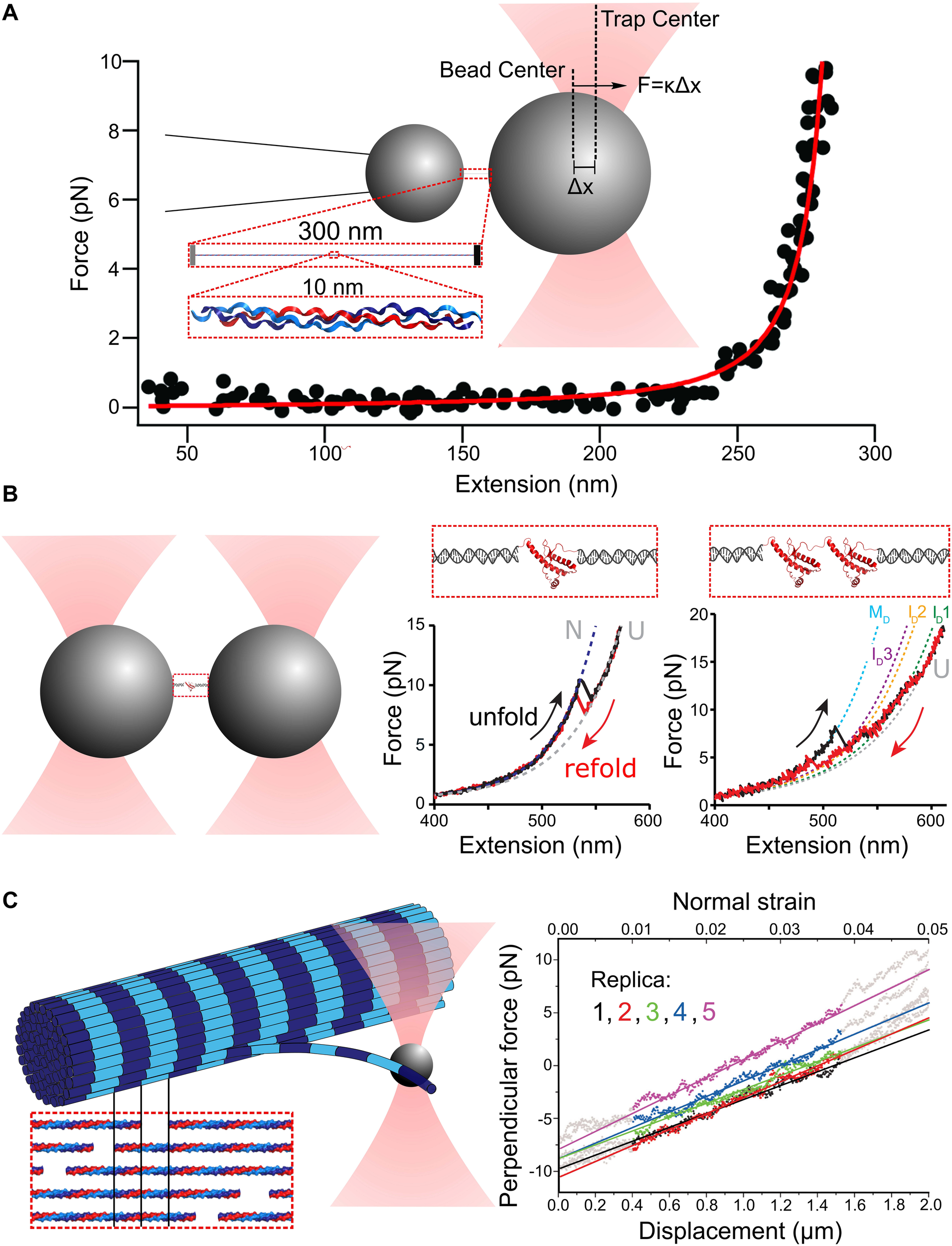 Probing a tethered molecule substantially shorter than the bead diameter also generates experimental challenges. Having two microspheres at separations much less than their sizes (and the size of the trapping laser focus/foci) can lead to optical interference between a bead and the other trap, an effect which must be deconvolved from the response to obtain the desired force readout of tension applied to the molecule (Downing et al., 2009; Rezaei et al., 2011). Measurements of such short polymers also suffer from amplified effects of stage drift and off-axis stretching. These shortcomings can be addressed by using DNA “handles” to link the protein ends to beads, thereby extending the separation between particles and avoiding unwanted optical interference (Figure 1B). DNA handles have become a standard complement of single-molecule measurements of protein folding with optical tweezers (Gosse et al., 2019; Avellaneda et al., 2020). The topic of force-induced protein unfolding, and what can be learned about the energy landscapes, is the subject of many reviews, to which we refer the interested reader (Bustamante et al., 2004, 2020; Ritchie and Woodside, 2015; Hughes and Dougan, 2016; Hoffer and Woodside, 2019).