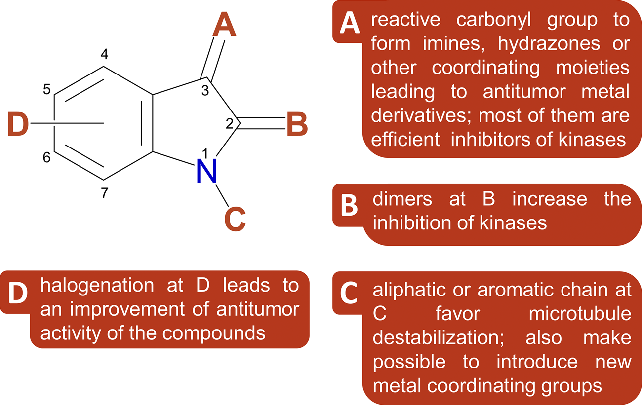 Usually, structural changes in organic compounds with the insertion of electron accepting or electron donating substituents, more lipophilic or hydrophilic groups, delocalization of electron density, can improve its properties for selected purposes. According to our search, a diversity of coordinating groups was introduced in the oxindole core, at different points of it, modulating the reactivity of isatin-derivatives as antiproliferative agents. Particularly, N donor groups (imines, amines, hydrazines, hydrazones, oximes, thiosemicarbazones) inserted in the isatin ring core were valuable and endorsed further studies, as discussed in Section Isatin-Derivatives as Anticancer Agents.