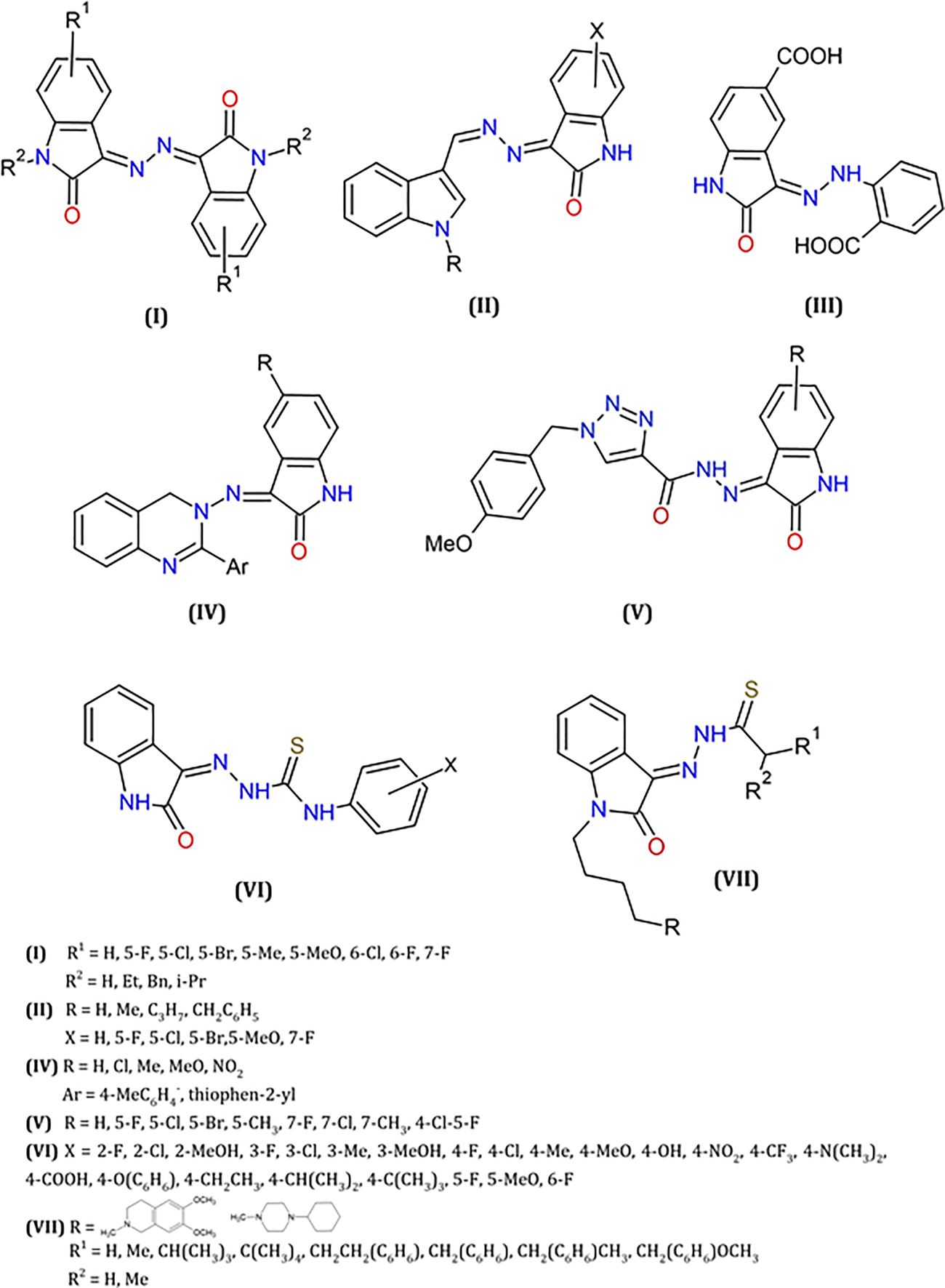 Particularly, hydrazine moieties were used as a linker to provide the construction of bis-isatin compounds with wide structural variety, and biological activities (Ibrahim et al., 2016). In an interesting study, a series of symmetrical bis-Schiff base derivatives were obtained by condensation of isatins, natural or synthetic, with hydrazine (Liang et al., 2014) (I, Figure 5). Evaluation of their in vitro antitumor activities indicated significant results, against various cancer cell lines (A549, lung adenocarcinoma epithelial cell; Hela, epithelial carcinoma cell; HepG2, liver hepatocellular cell; U251, glioma cell; SGC-7901, human gastric carcinoma cells). For the most active compound (3,3′-(hydrazine-1,2-diylidene)bis(5-methylindolin-2-one), IC50 values in the range 4–13 µM were determined, and further in vivo studies indicated a substantial inhibition of tumor growth in mice.
