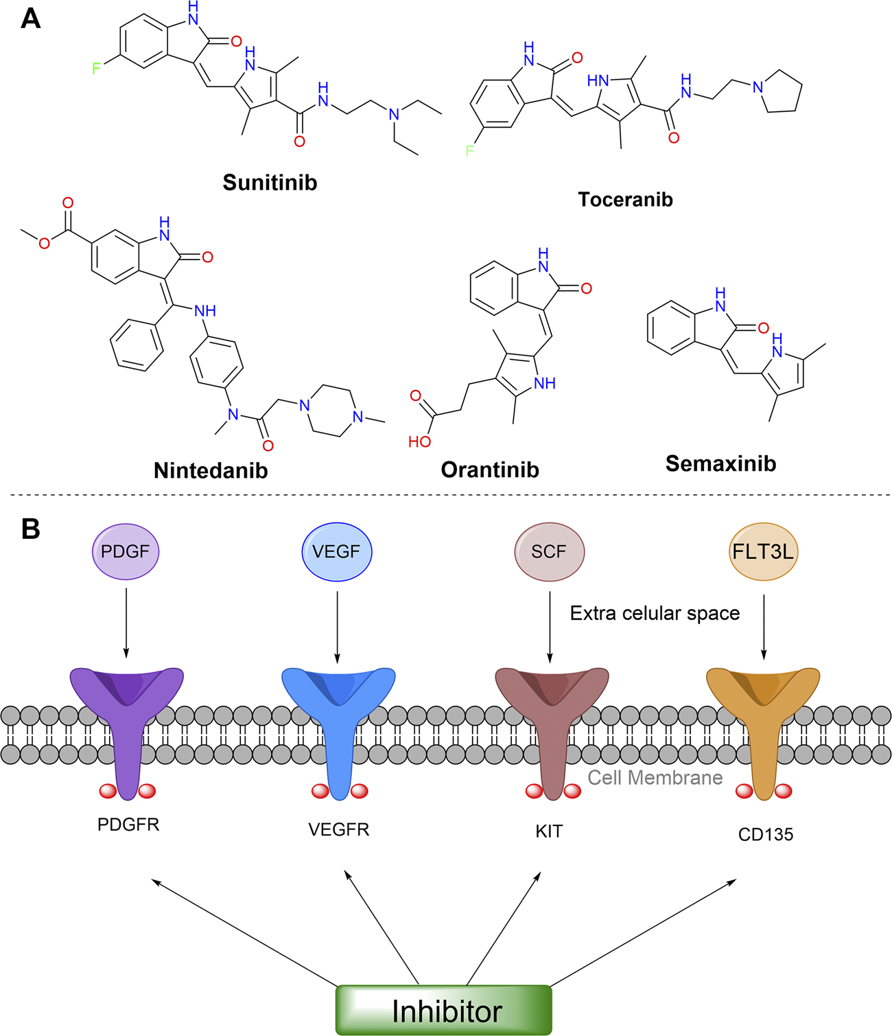 (A) Structures of isatin-derived compounds in clinical trials or already approved. (B) Some targets involved in general mechanism of action of these compounds. Abbreviations: VEGF, vascular endothelial growth factor; VEGFR, vascular endothelial growth factor receptors; PDGF, platelet-derived growth factor; PDGFR, platelet-derived growth factor receptors; KIT, stem cell factor receptor; SCF, stem-cell factor; CD135, cluster of differentiation antigen; FLT3L, FMS-like tyrosine kinase 3 ligand.