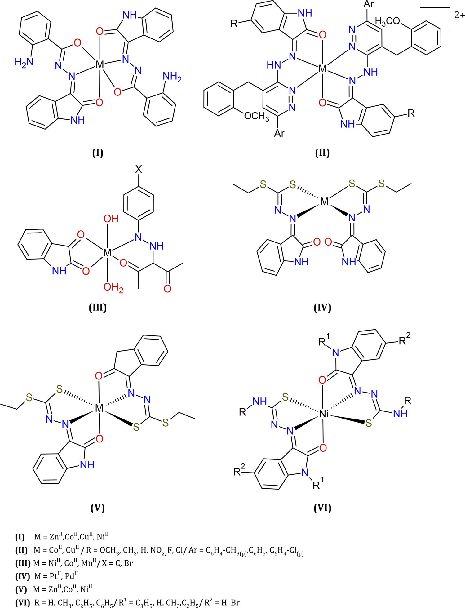 Some examples of metal complexes with isatin-derivatives: hydrazone, thiocarbazine or thiosemicarbazone, reported as antitumor agents.