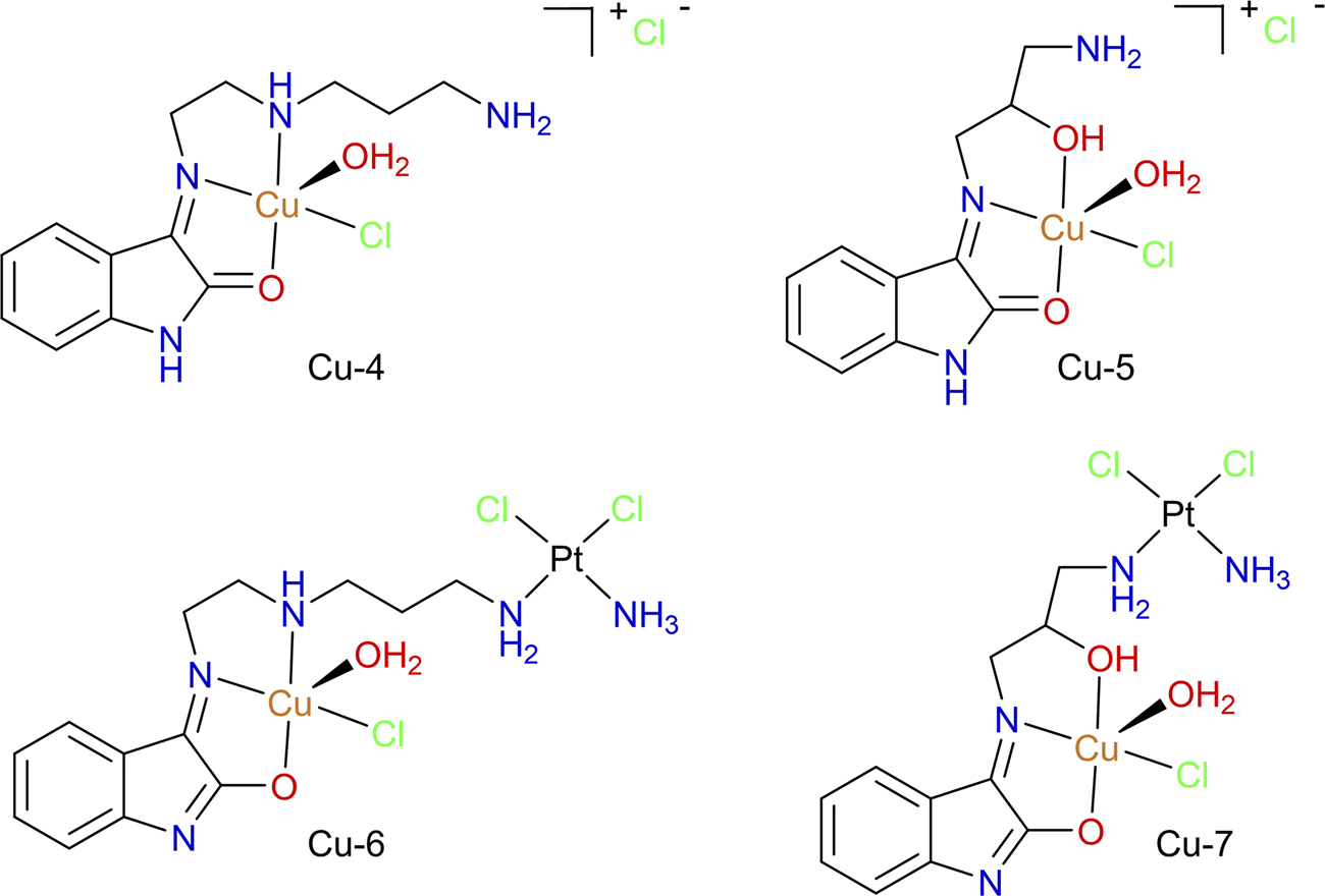Many hydrazones derived from isatin were used in complex formation reactions and gave rise to stable metal complexes with significant antiproliferative properties, especially complexes of divalent ions such as manganese(II), cobalt(II), nickel(II), copper(II) and zinc(II) (see Figure 7).