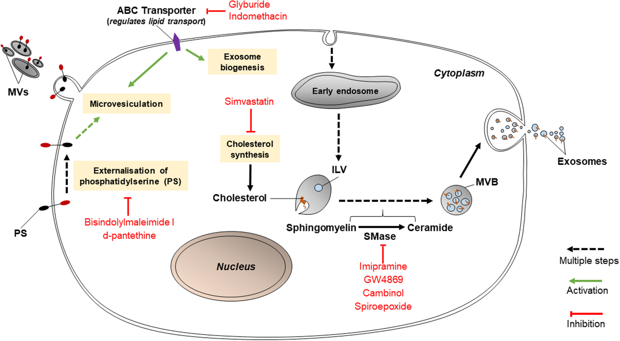 Inhibitors of lipid-related pathways (bisindolylmaleimide-I, d-pantethine, glyburide, indomethacin, simvastatin, imipramine, GW4869, cambinol, and spiroepoxide) inhibit EV biogenesis.