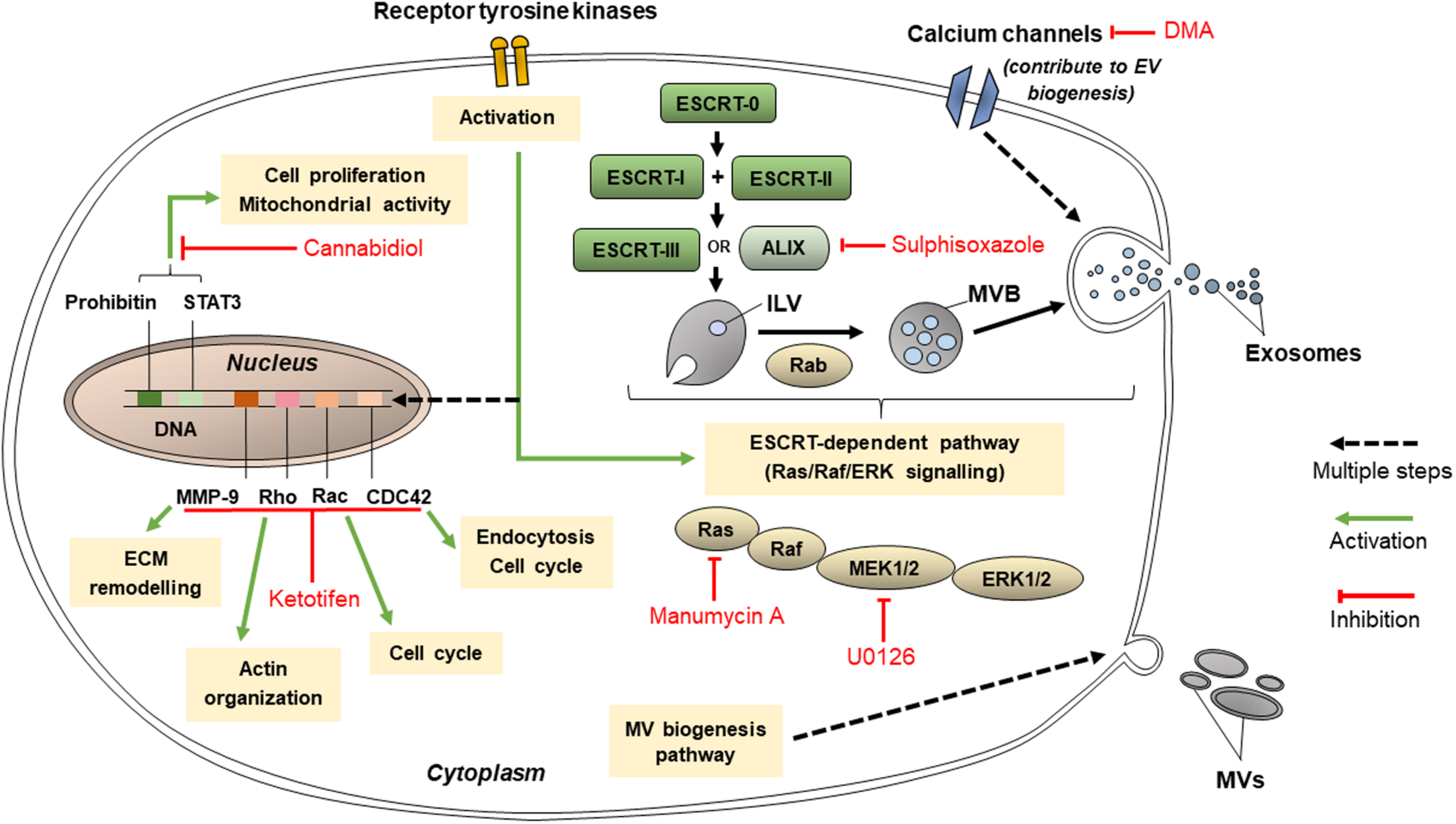 Pathways that targeted by cannabidiol, ketotifen, manumycin A, U0126, sulphisoxazole, and dimethyl amiloride (DMA) for inhibition of EV release.